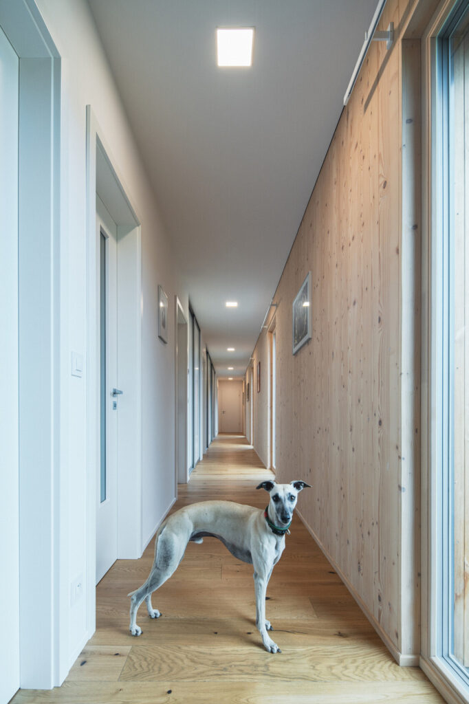 Glavna os hiše – dolg hodnik z vgrajenimi knjižnimi policami – povezuje bivalne in intimne dele med seboj ter kot tak deluje kot hrbtenica hiše. Konstrukcija objekta je iz masivnih lesenih plošč, ki zagotavljajo visoko togost, odlično izolativnost in prijetno notranjo klimo. Fasado prekriva termično obdelan les, ki z naravnim staranjem postopoma prehaja v odtenke okolice in se zliva z zelenjem. Enokapna zelena streha hišo dodatno povezuje s krajino.