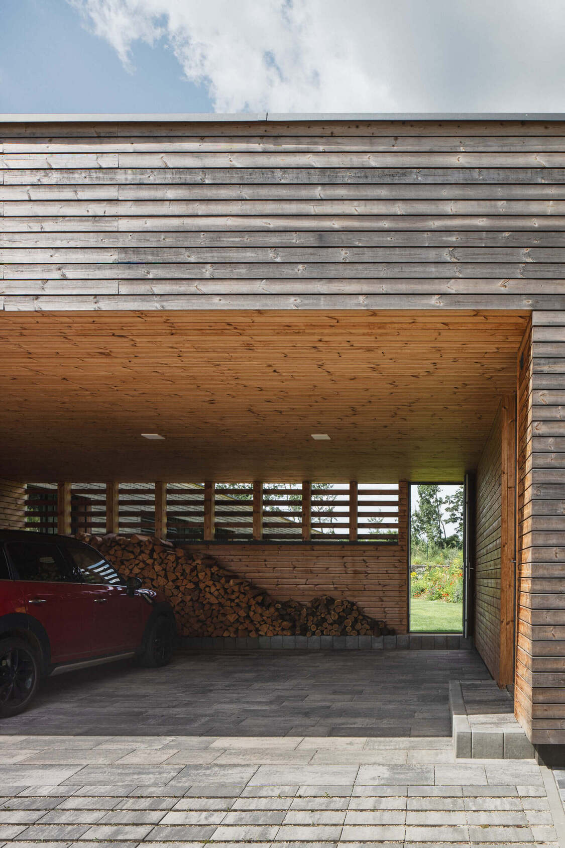 Stavba ima tloris v obliki črke L in izkorišča rahel naklon terena. S ceste deluje skromno in ne pleni pogledov, s čimer spoštuje okolico in hkrati ponuja največjo zasebnost. Njena notranjost pa se odpira proti intimnemu vrtu – skrbno oblikovanemu koščku zemlje, ki se nežno dviga proti gozdu in zliva z naravo.