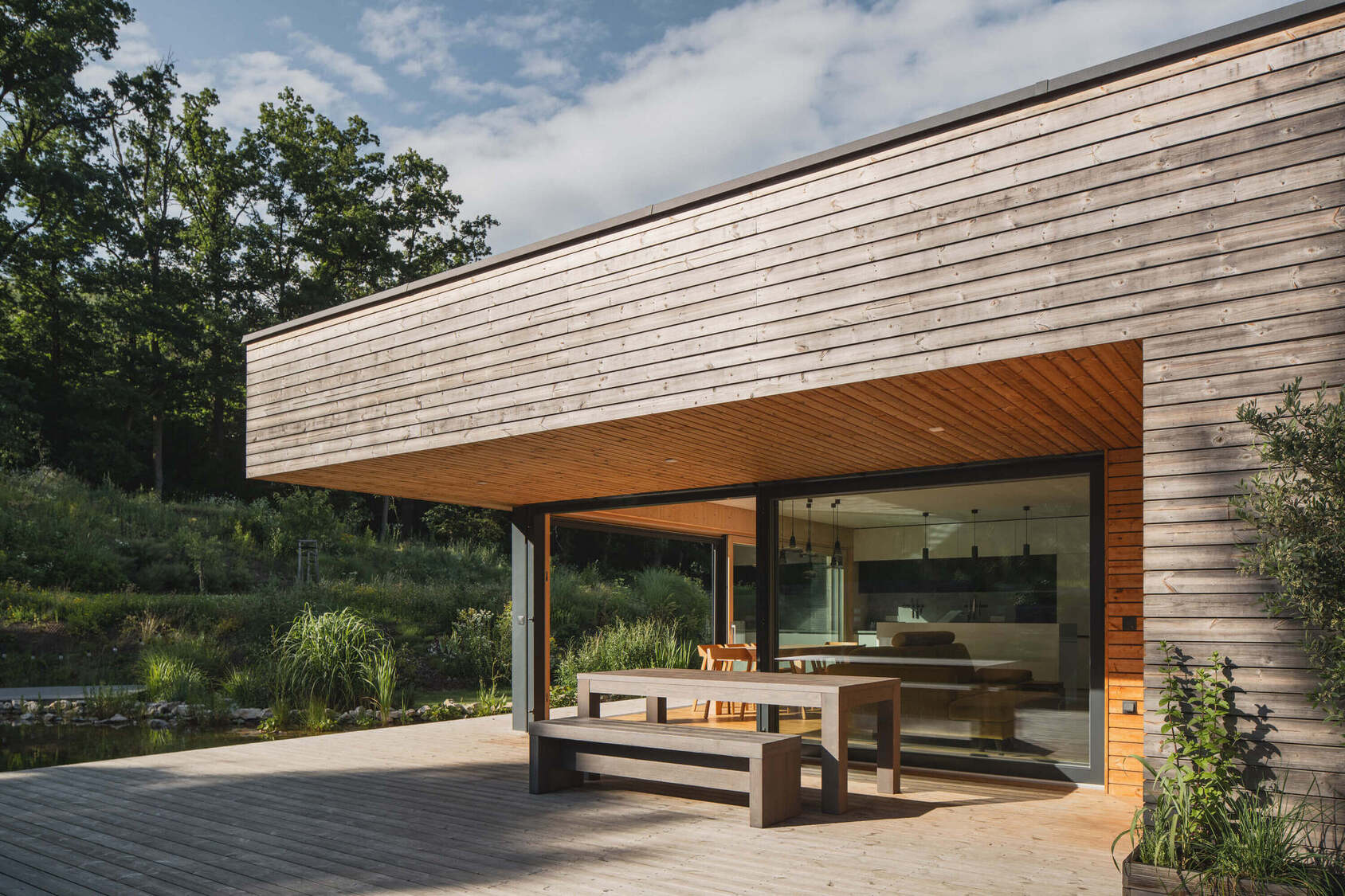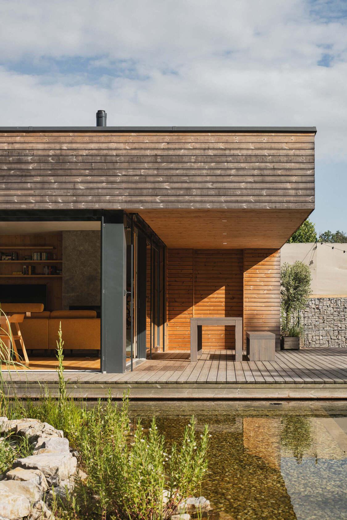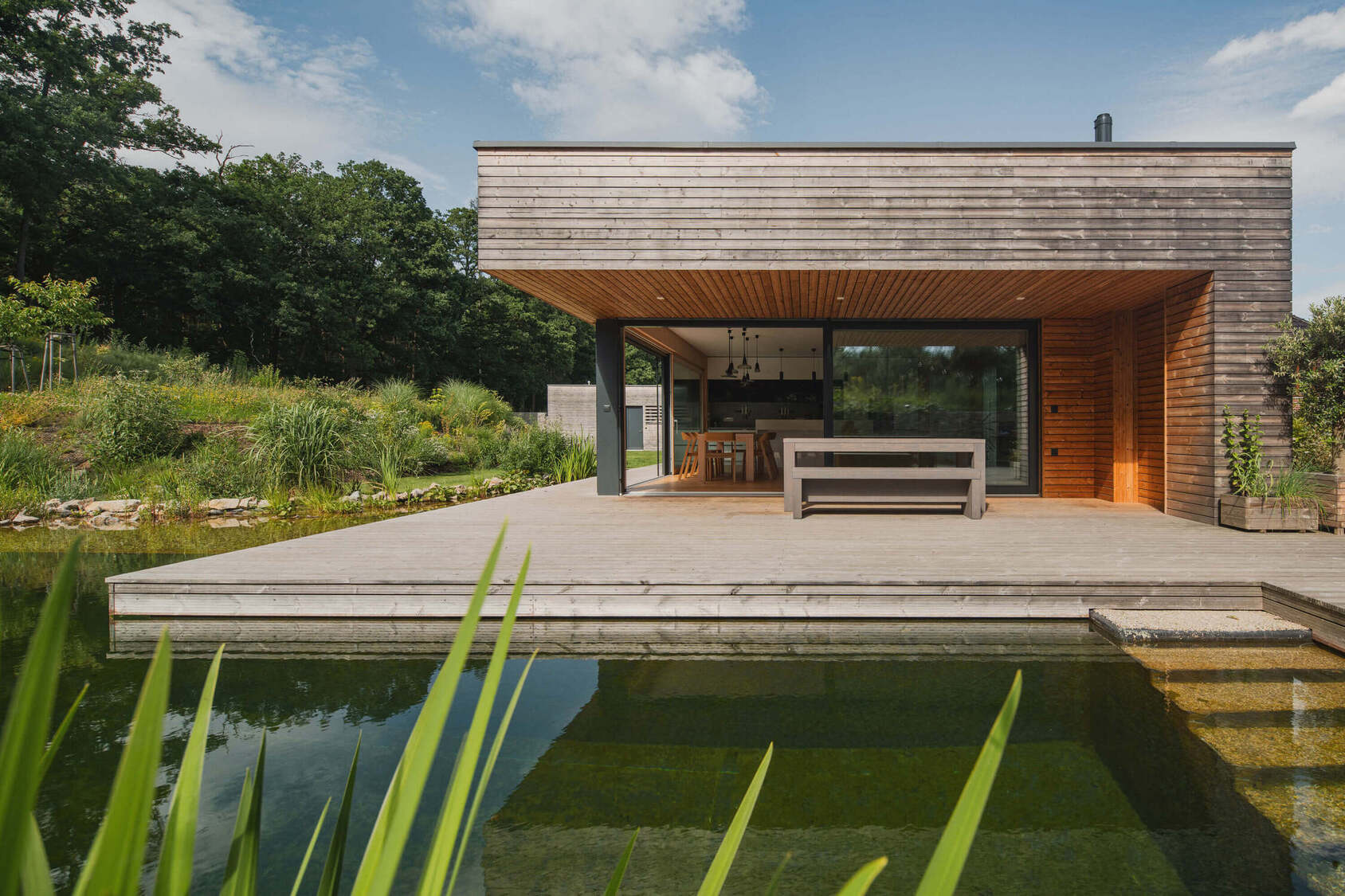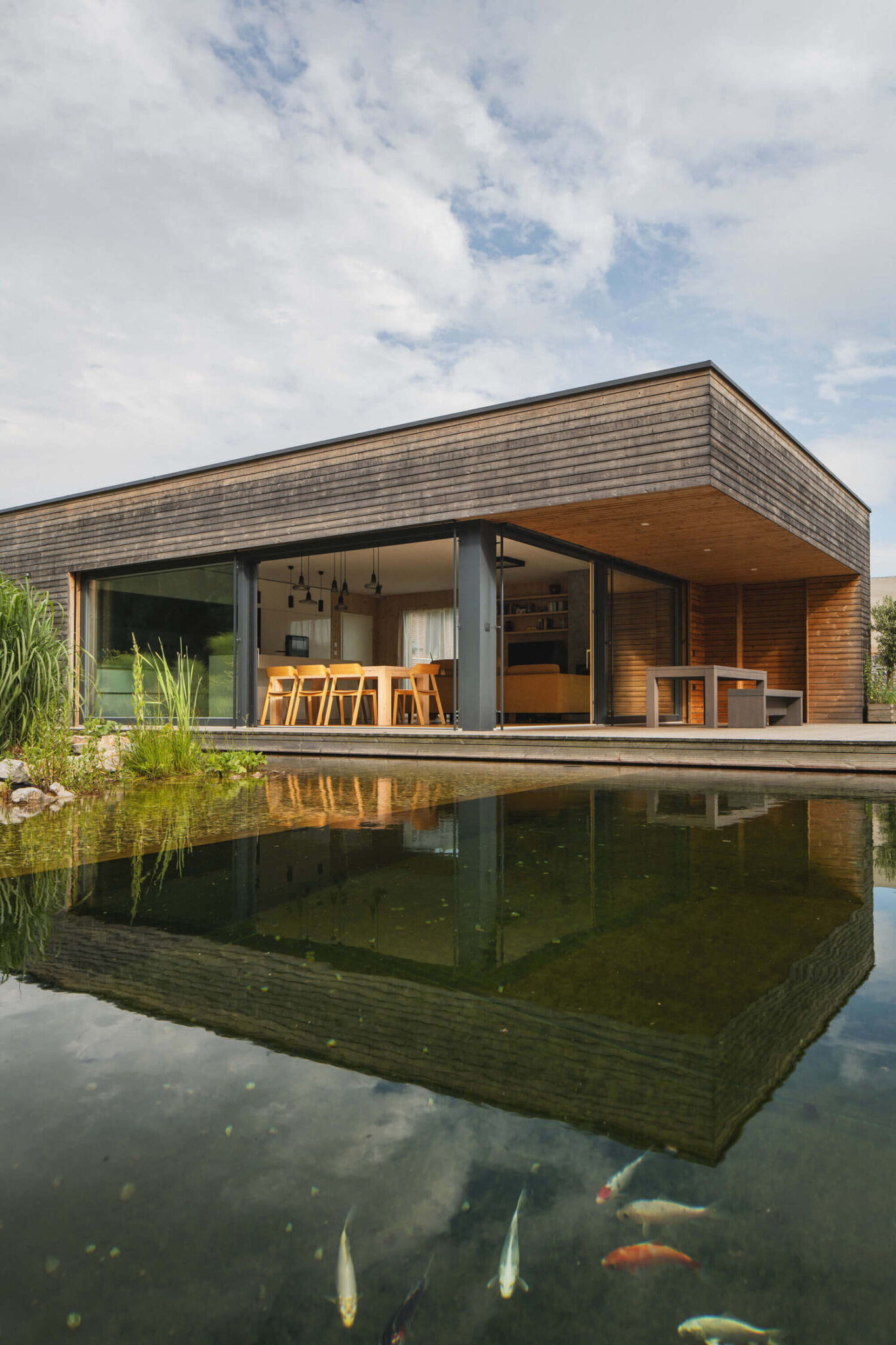Osrednji element vrta je kopalni ribnik – pravo srce doma. Nad njim se dviguje lesena terasa, ki služi kot podaljšek bivalnega prostora. Dve veliki drsni zasteklitvi povežeta notranjost in zunanjost, tako da se dnevni prostor, terasa in vrt združijo v en sam živi organizem.
