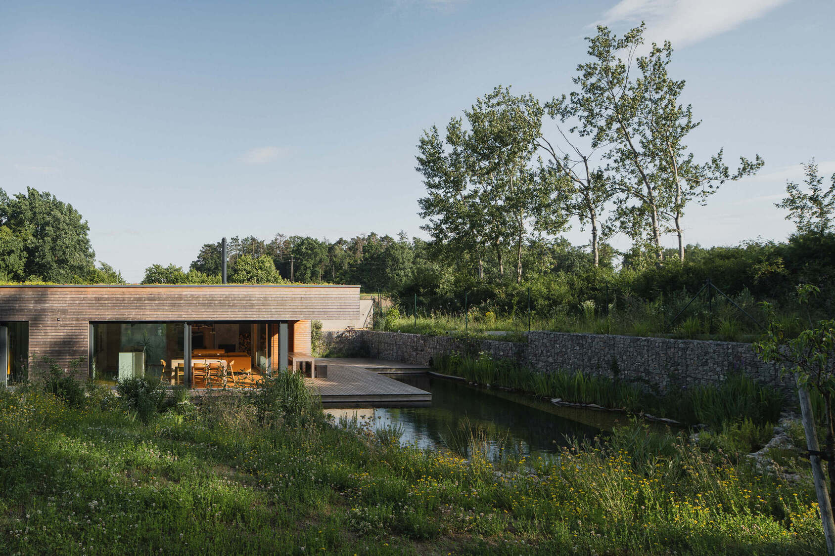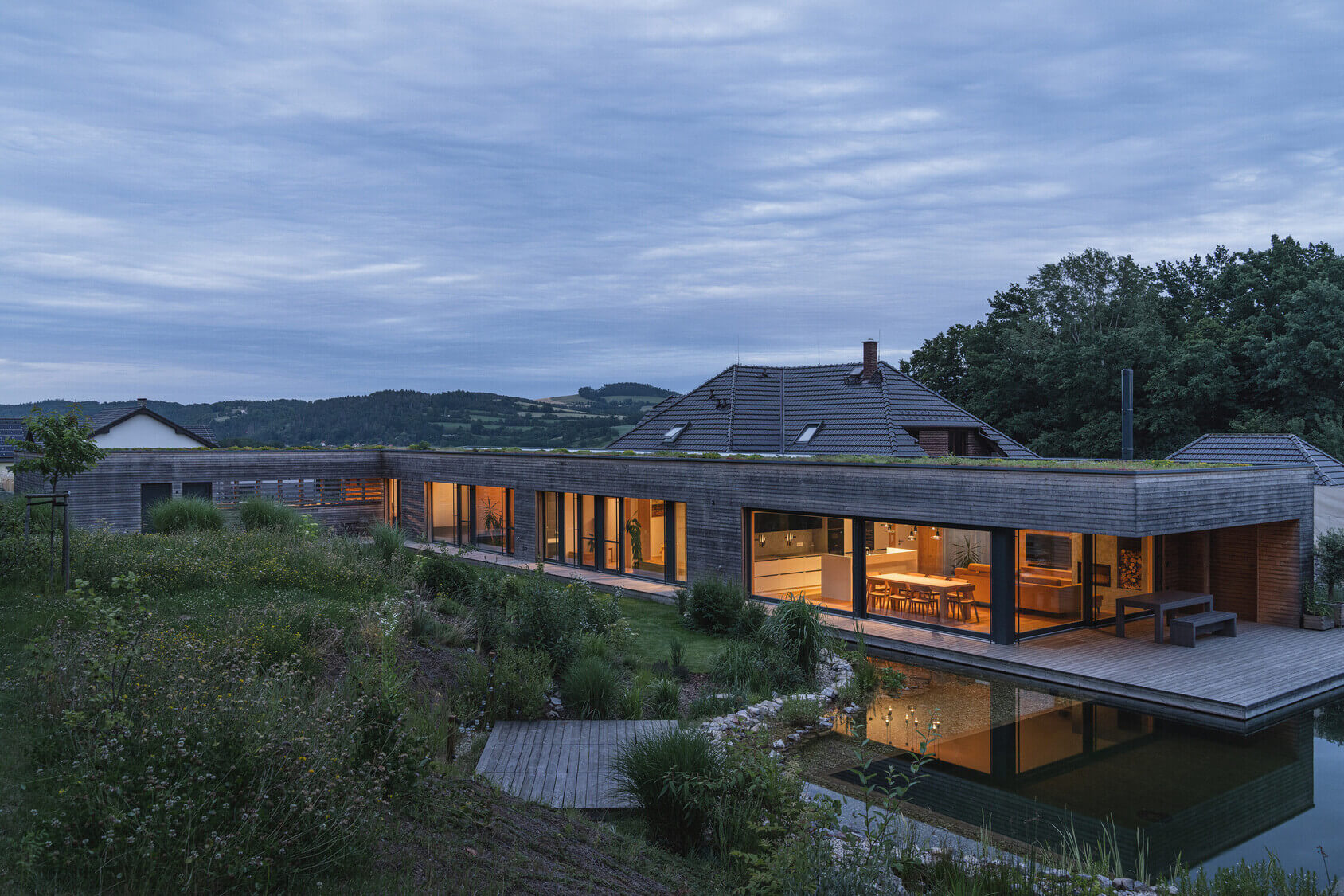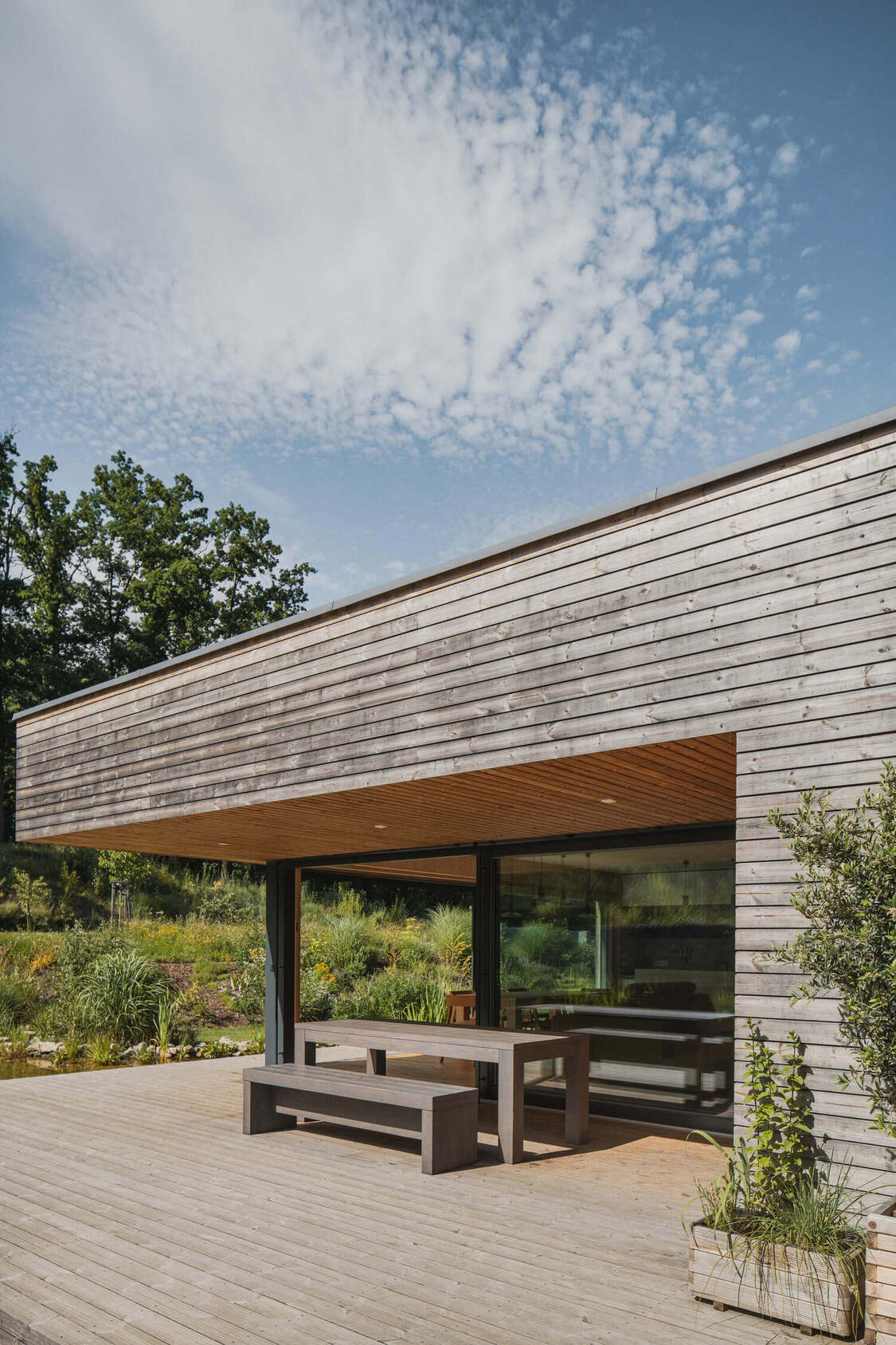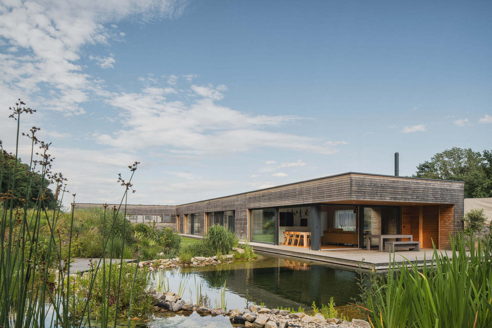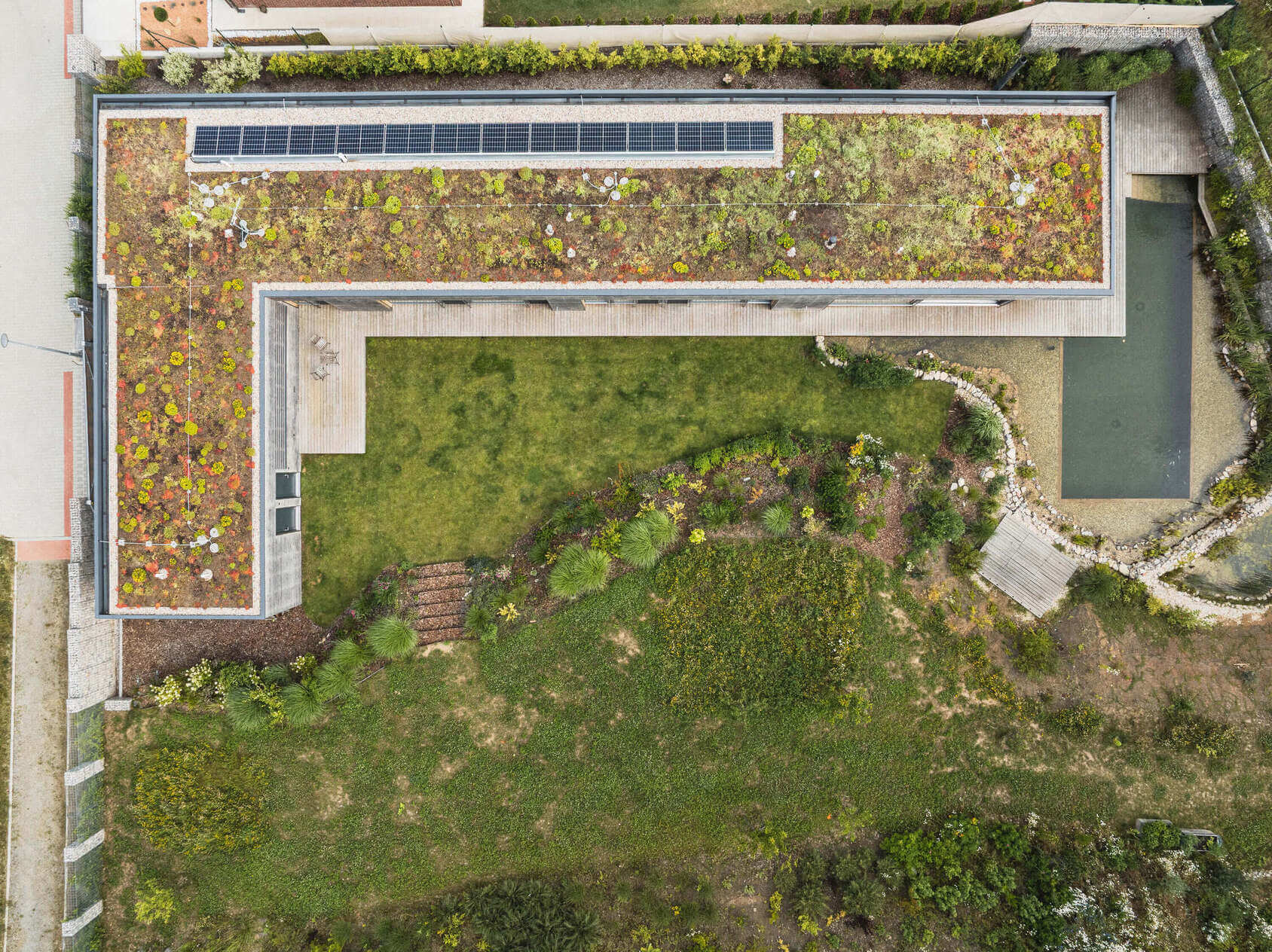 Osrednji element vrta je kopalni ribnik – pravo srce doma. Nad njim se dviguje lesena terasa, ki služi kot podaljšek bivalnega prostora. Dve veliki drsni zasteklitvi povežeta notranjost in zunanjost, tako da se dnevni prostor, terasa in vrt združijo v en sam živi organizem.