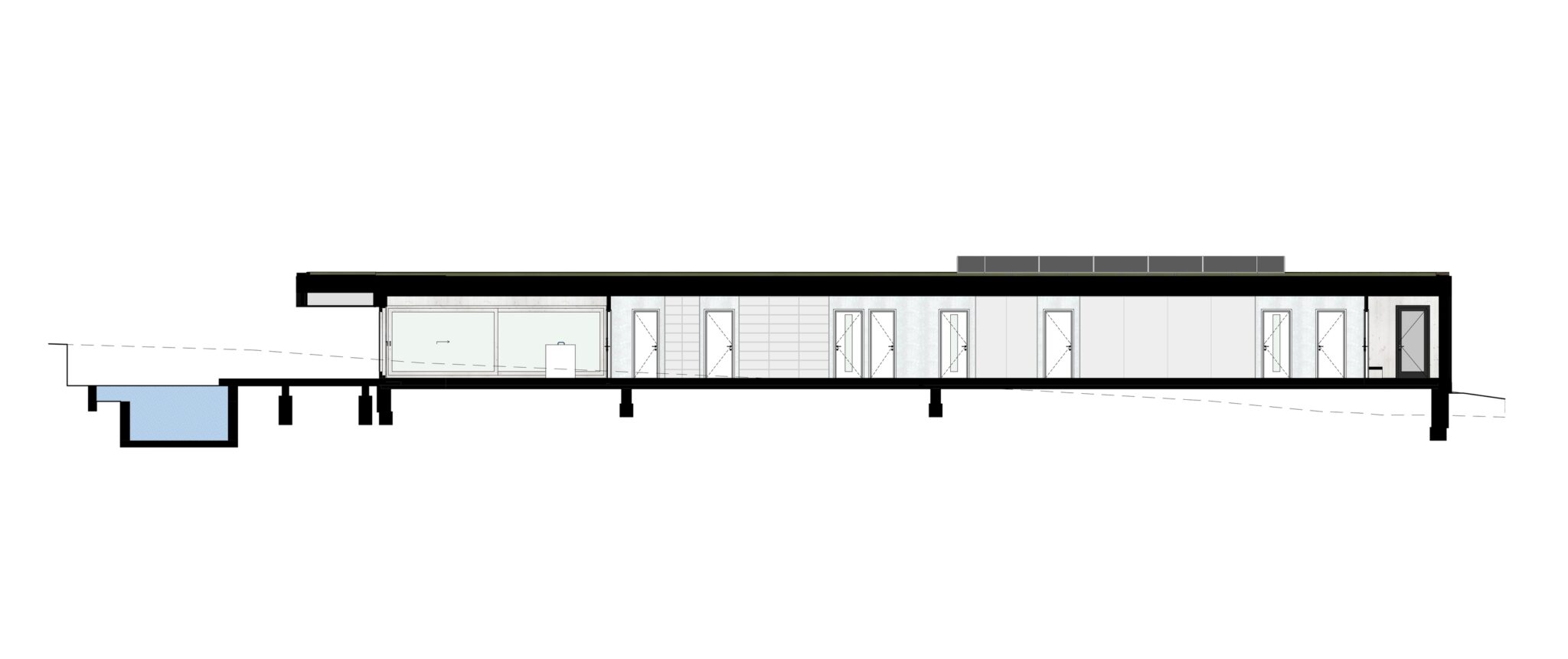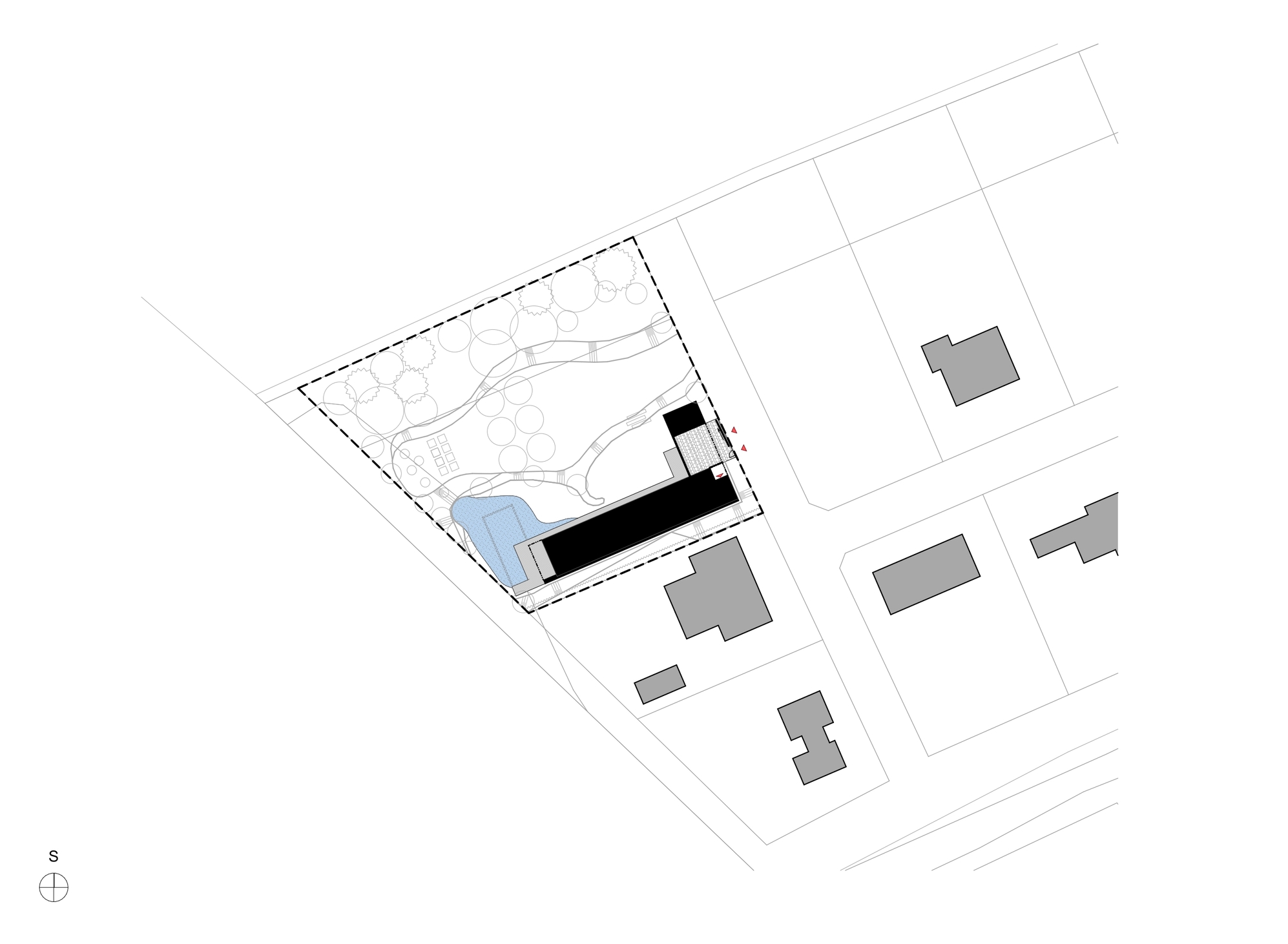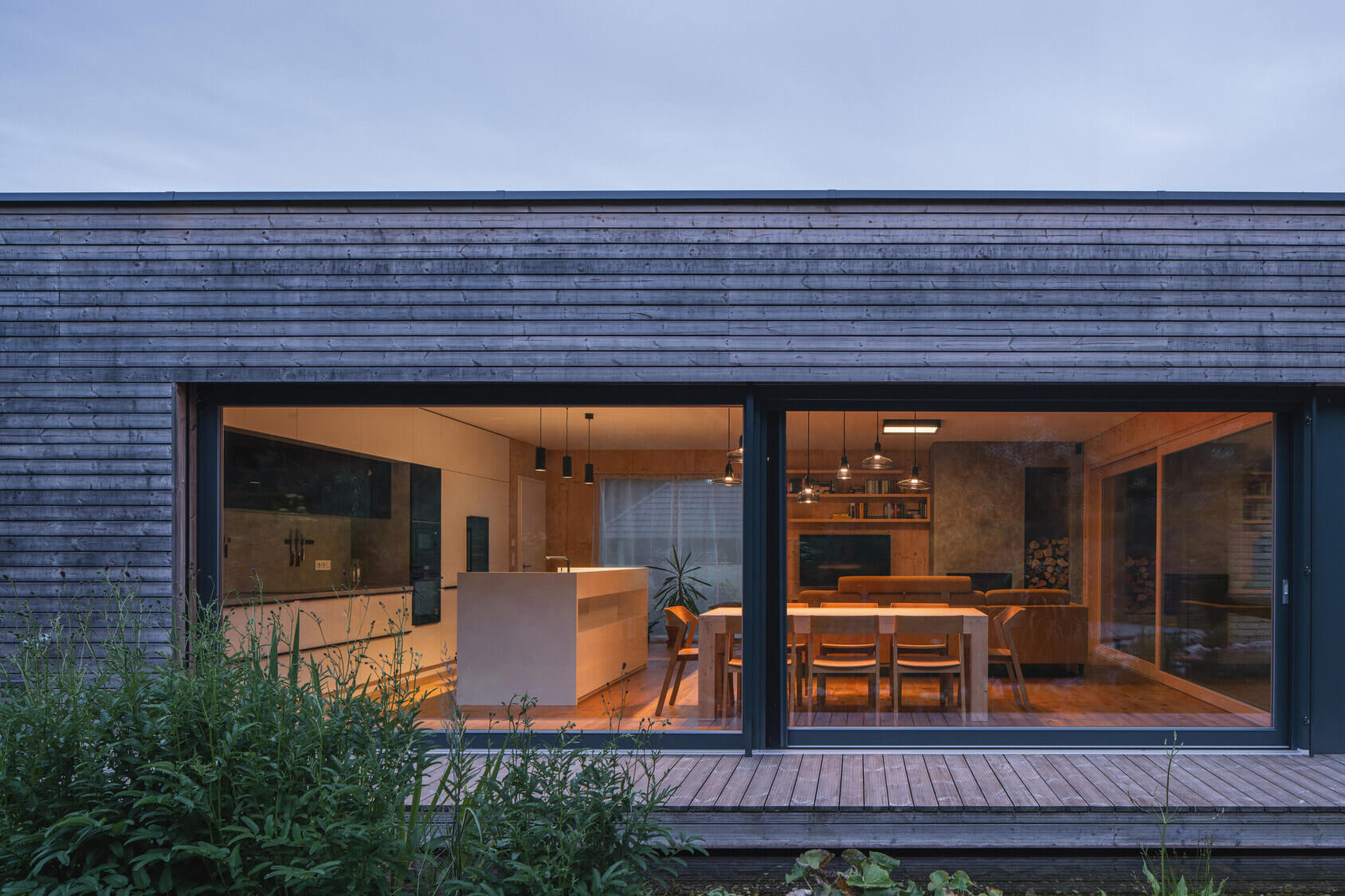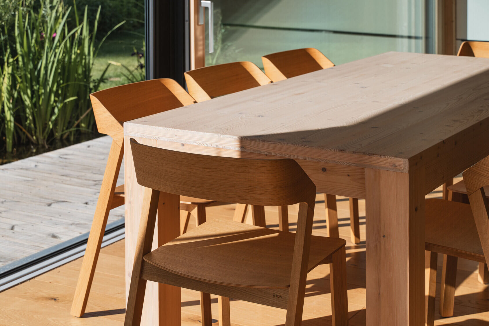 Osrednji element vrta je kopalni ribnik – pravo srce doma. Nad njim se dviguje lesena terasa, ki služi kot podaljšek bivalnega prostora. Dve veliki drsni zasteklitvi povežeta notranjost in zunanjost, tako da se dnevni prostor, terasa in vrt združijo v en sam živi organizem.