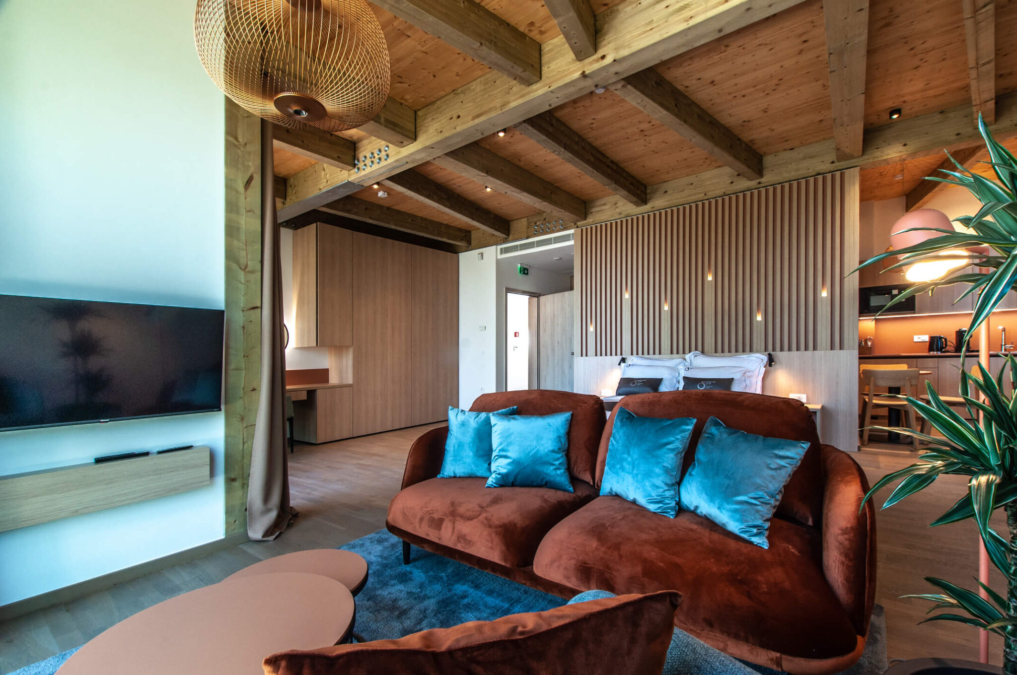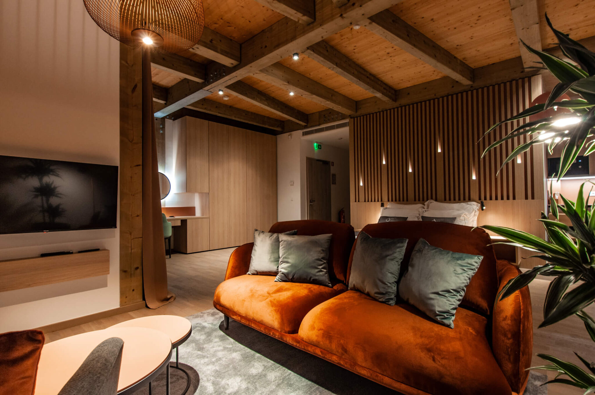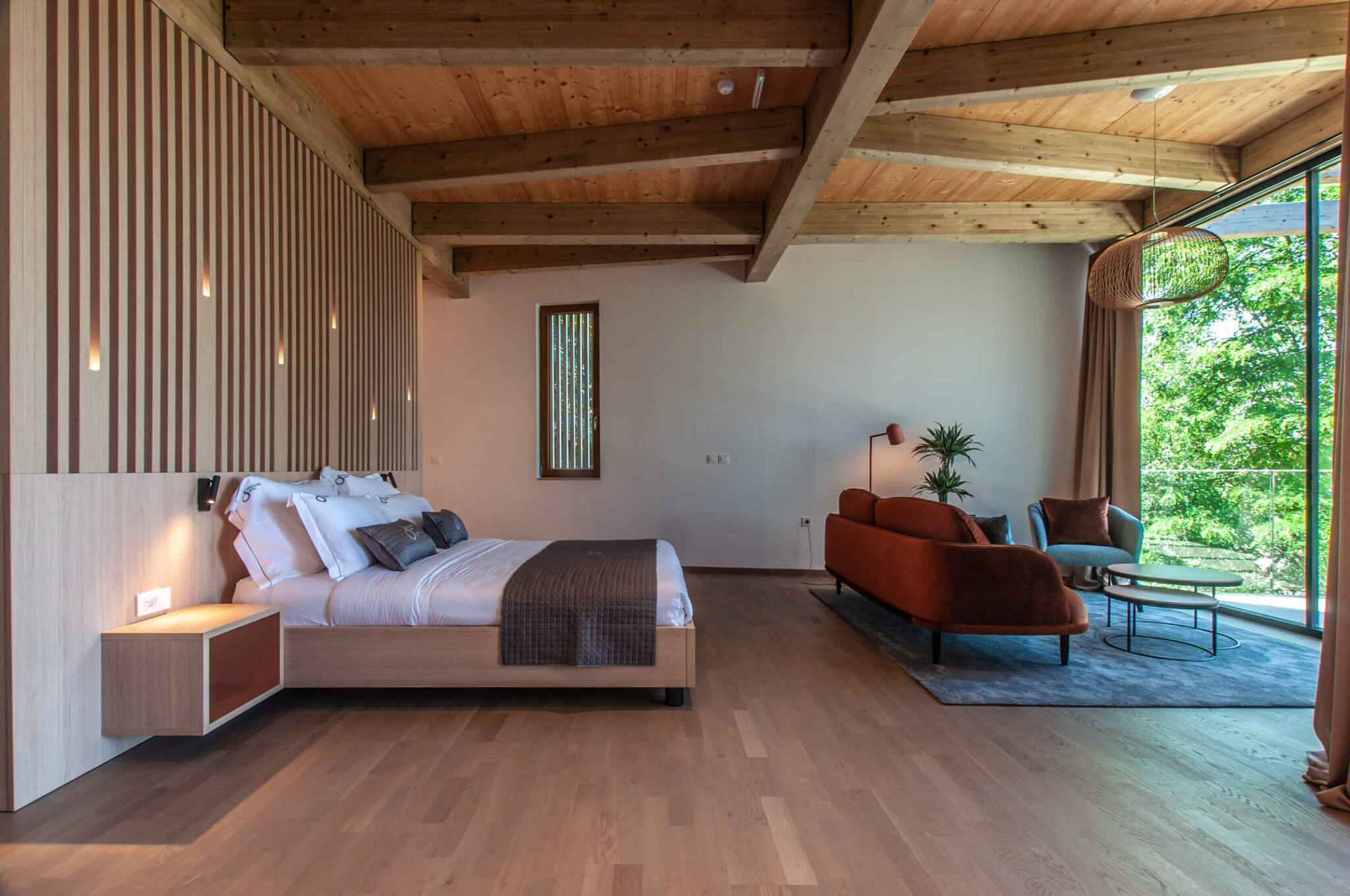 Rdeča nit opreme obeh apartmajev izhaja kar iz njunih imen. Friderik z bolj moško, Eleonora pa ženstveno barvno paleto. »Les, ki ga je veliko na stropu in na tleh, smo želeli malo poživiti z barvo in zato sta dodani dve – v prvem pistacija oziroma pastelno zelena, v drugem opečna karamel. Odločitev za ti dve barvi izvira iz kopalnice, kjer smo uporabili velikostensko in tankostensko italijansko keramiko v teh dveh barvah, ki smo ju potem prenesli še v interjer, v tekstil in kakšne manjše dodatke, da je prostor malo bolj živahen,« pove Majda Kregar.