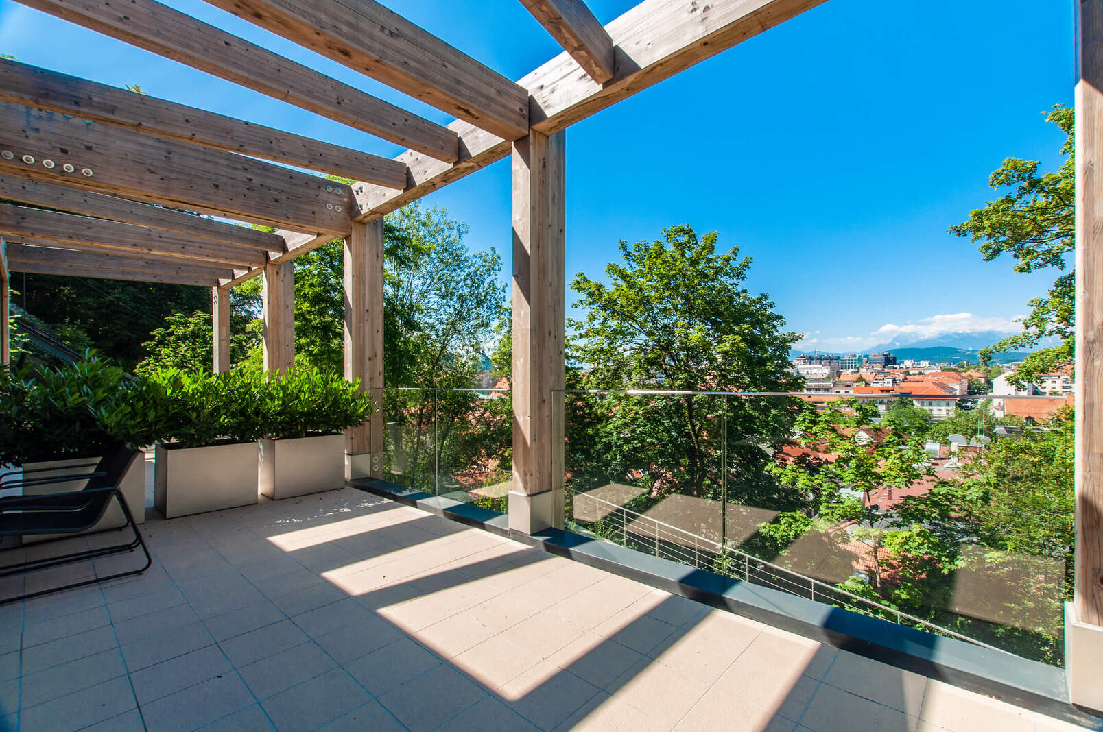 Apartmaja sta velika po 53 m2, imata razkošni kopalnici, njuna zvezda pa je po 12 m2 velika terasa, ki ponuja idilične poglede na Ljubljano. »Koncept naše zasnove je bil ustvariti mirno delovno okolje, prijetne apartmaje, zagotoviti dovolj svetlobe na hladnem severnem pobočju hriba ter odpreti lepe poglede na mesto. Z ozelenitvijo okolice so bo objekt sčasoma kot lahkoten paviljon lepo potopil, integriral v Grajski hrib,« sklene arhitektka.