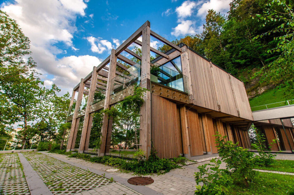 Skoraj ničenergijsko, trajnostno gradnjo pa so poleg lesa dosegli še z drugimi načini in materiali. V objekt so na primer vgradili toplotno črpalko z rekuperacijo, ki vrača 85 % energije, z dobro izolacijo vseh zidov in strehe, zeleno streho in stekli. »Fasadna stekla so zelo zanimiva, ker je to slovenski patent. So izredno izolacijska in tudi ne potrebujejo nobenih žaluzij,« pojasnjuje arhitektka.