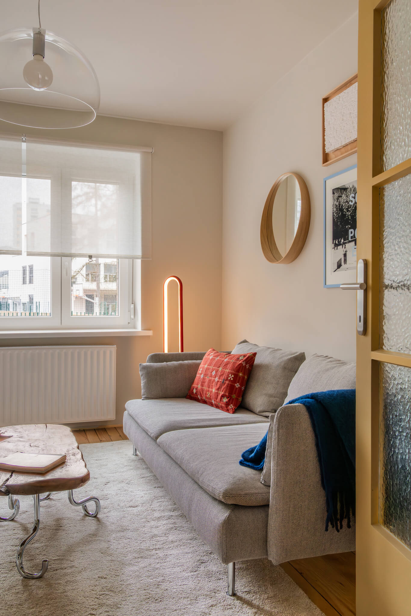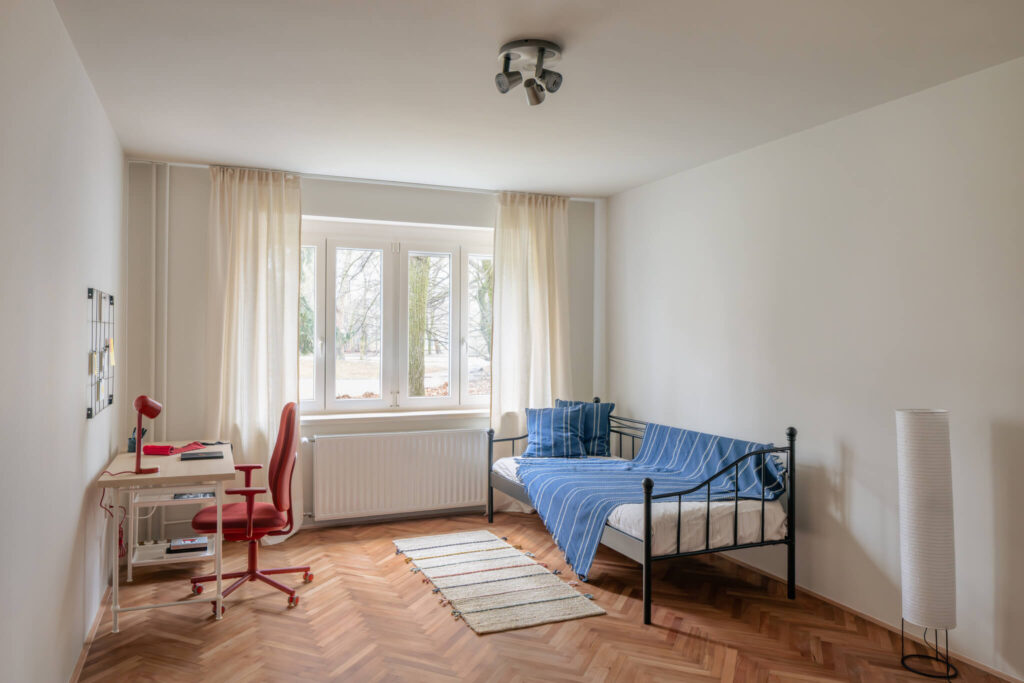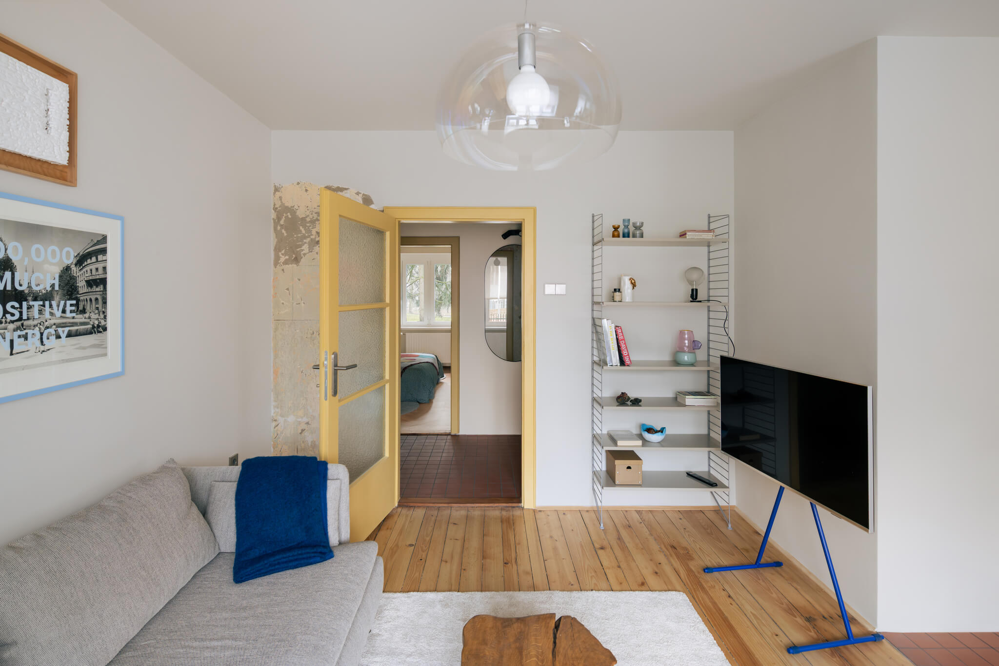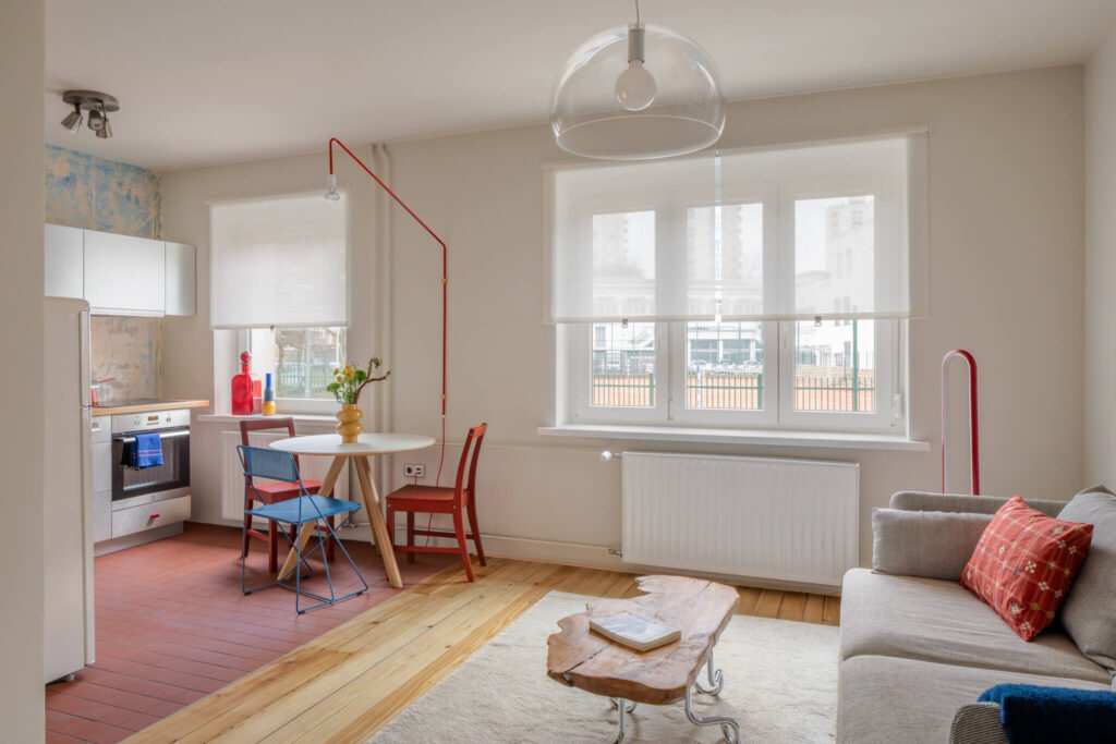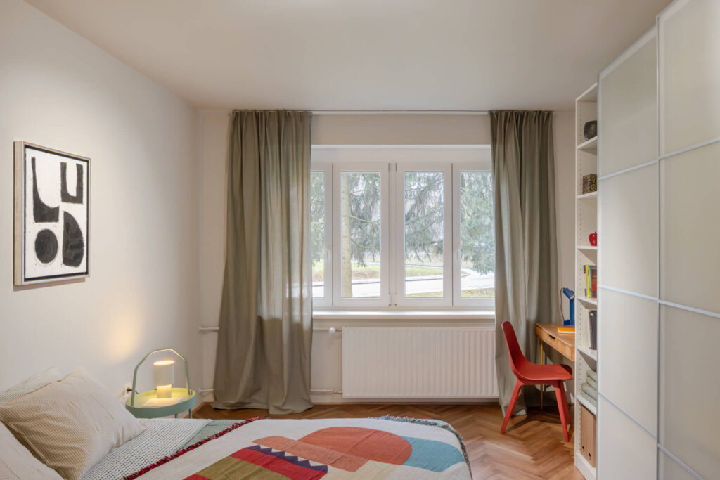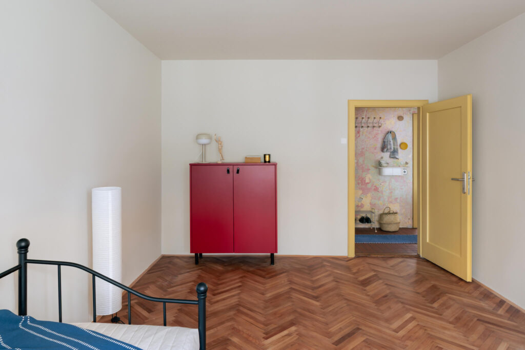 Stanovanje ni opremljeno po enotnem principu, temveč deluje kot premišljeno sestavljena celota. V njem se prepletajo najdeni kosi z bolšjih trgov, dostopno oblikovanje in posamezni oblikovalski poudarki. Rezultat prenove je prostor, ki ne skriva svojih plasti, temveč jih izpostavlja. Namesto popolne uniformnosti ponuja zgodbo – o času, materialih in ljudeh, ki so ga soustvarjali.