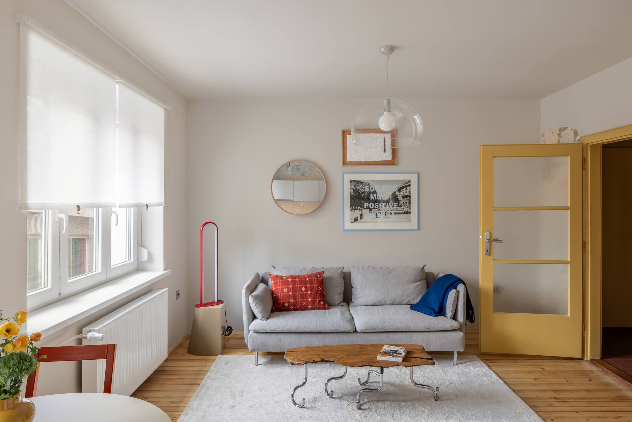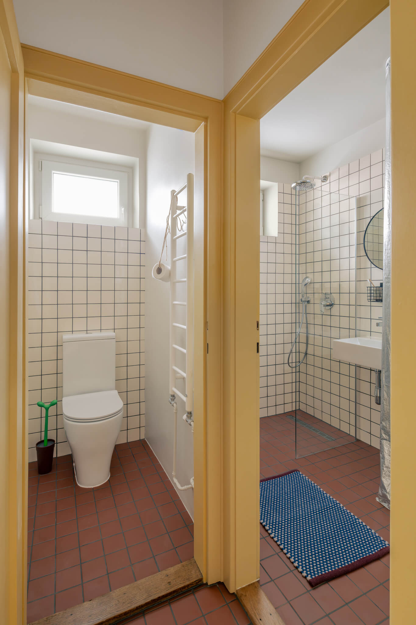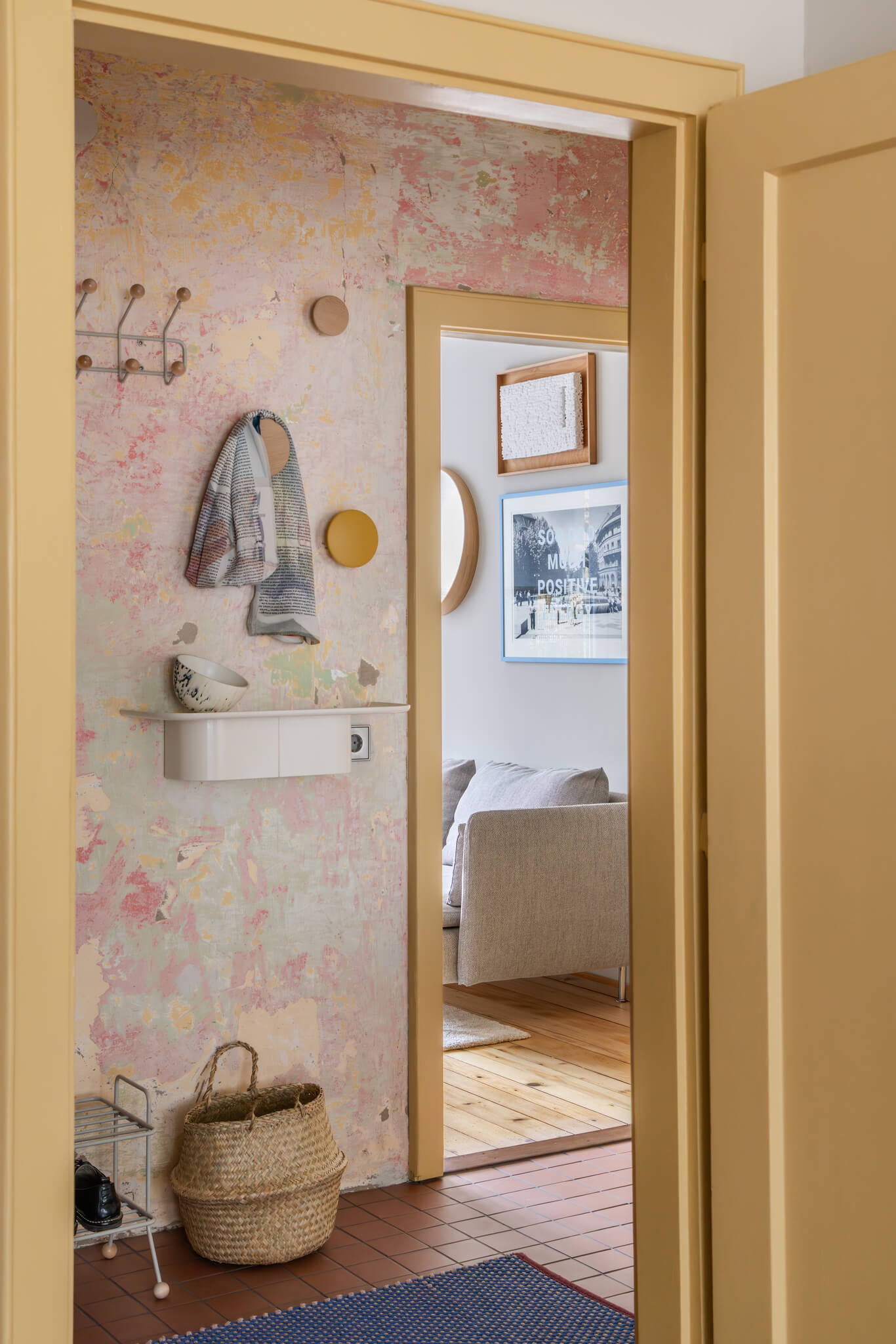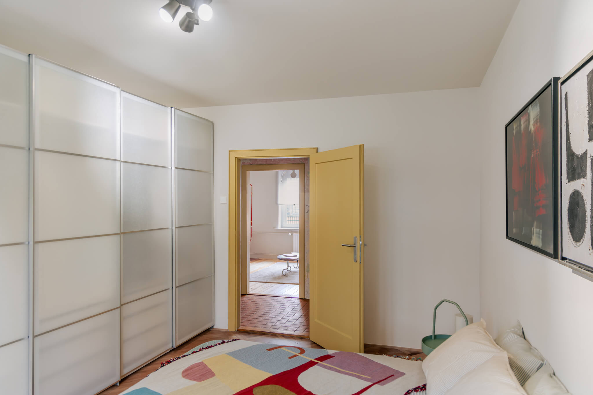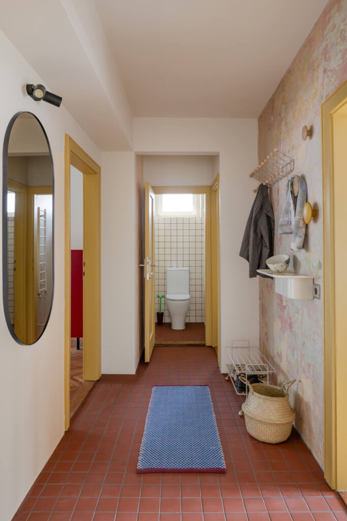 Tudi masivna notranja vrata so bila ohranjena, restavrirana in obarvana v značilno rumeno barvo, ki subtilno poveže posamezne prostore in vnese igriv, a premišljen barvni poudarek.