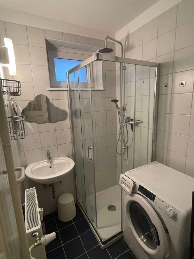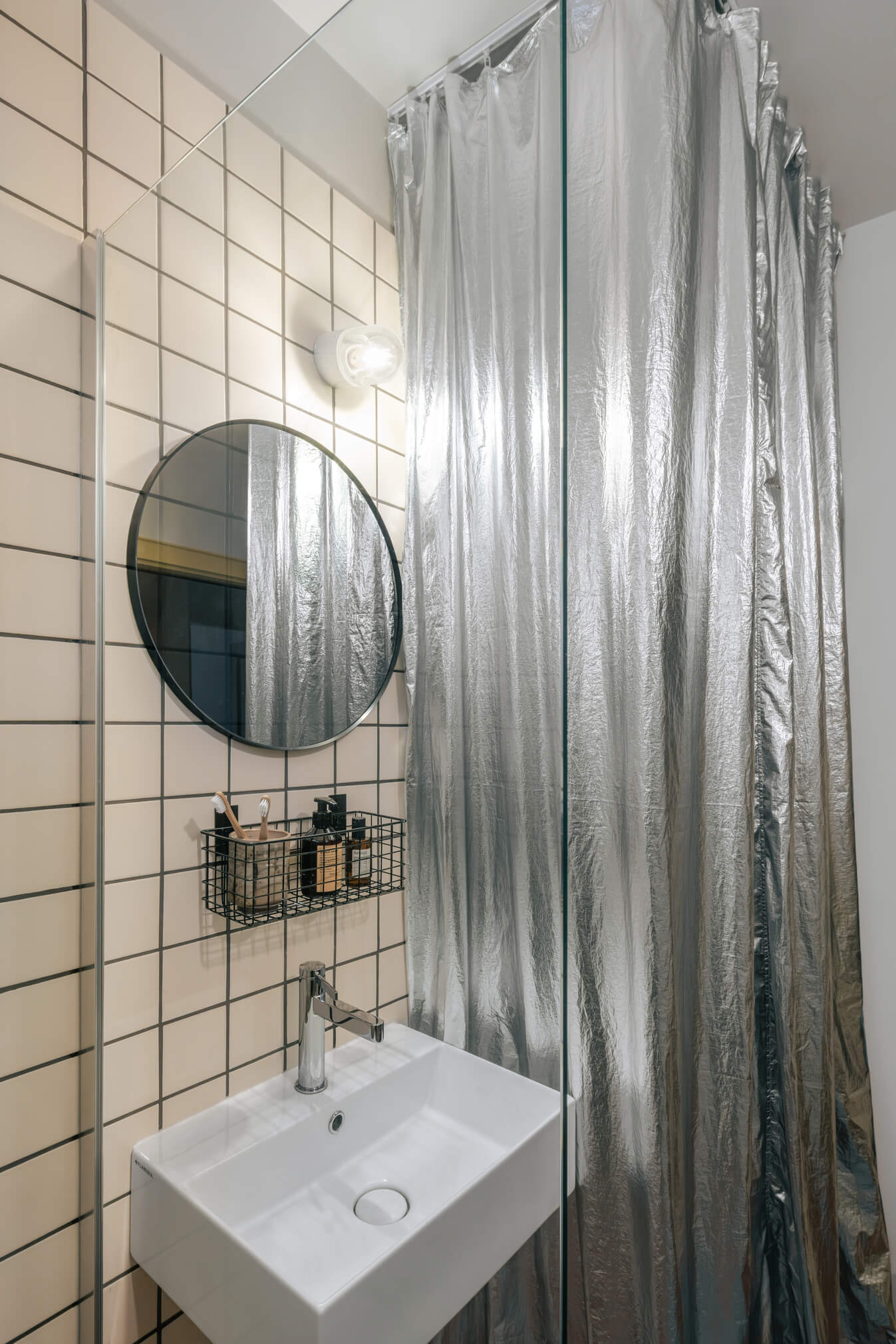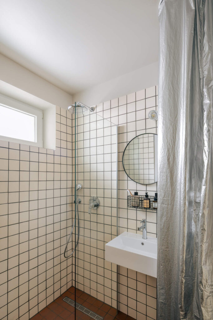 Materialna paleta je premišljena, a hkrati sproščena. V prostorih, kjer originalnih tlakov ni bilo mogoče ohraniti, so jih nadomestili z italijansko keramiko v toplih terakota tonih, ki se lepo navezuje na obstoječe elemente. Kopalnica je zasnovana sodobno, z walk-in prho in enotno keramiko, ki ustvarja umirjeno ozadje. Poseben poudarek pa predstavlja srebrna zavesa, ki v prostor vnese nepričakovan, skoraj scenografski moment.