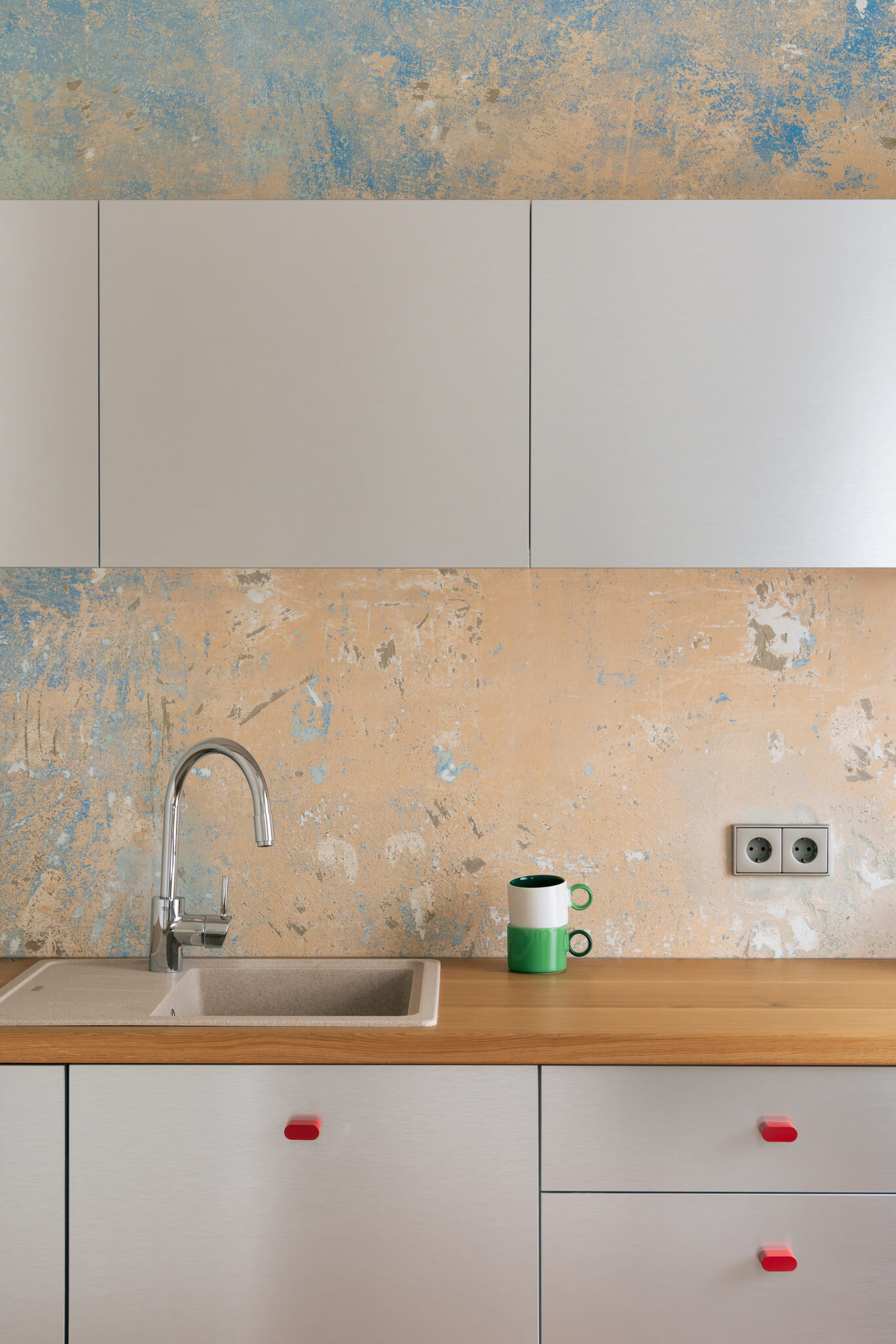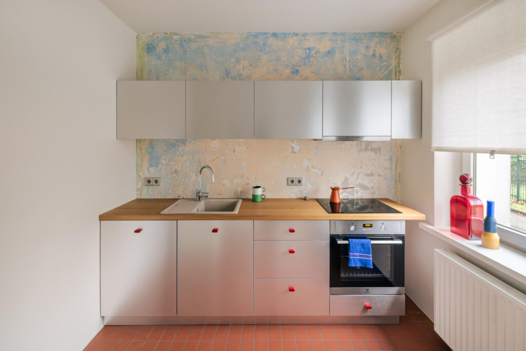 Posebno zgodbo pripovedujejo tudi stene. Med odstranjevanjem starih nanosov barve so se razkrile plasti različnih odtenkov – nekakšne »freske časa«, ki jih je arhitektka ohranila kot izrazit vizualni element. Ta surova, skoraj slikarska tekstura prostoru doda nepričakovano globino in avtentičnost.