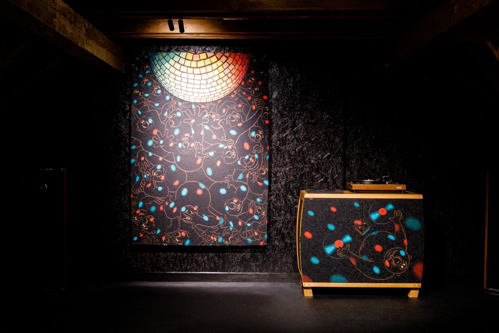 Glasbene sobe danes niso nikakršna posebnost, najmanj, kar lahko zasledimo v interierju ljubiteljev glasbe, so kotički, opremljeni z izbranimi gramofoni in ploščami. Audiofile bo tako navdušilo sodelovanje s priznanim slovenskim izdelovalcem gramofonov Kuzmo, za katerega so izdelali set vezene omarice z motivom jezera Tahoe (motiv Alberta Bierstadta), na podstrešju pa lahko občudujemo prav takšno omarico z motivi plešočih medvedov (motiviko predstavljajo plešoči medvedje, ki so jih v Vzhodni Evropi, po priključitvi EU, iz cirkusov izpustili na prostost, znanstveniki pa so z raziskavami ugotovili, da jih je cirkuška izkušnja tako travmirala, da še dandanes poplesujejo po tamkajšnjih gozdovih), ki je plod sodelovanja s številnimi slovenskimi ustvarjalci (Vladimir Leben, Pešo rokodelec itd.).