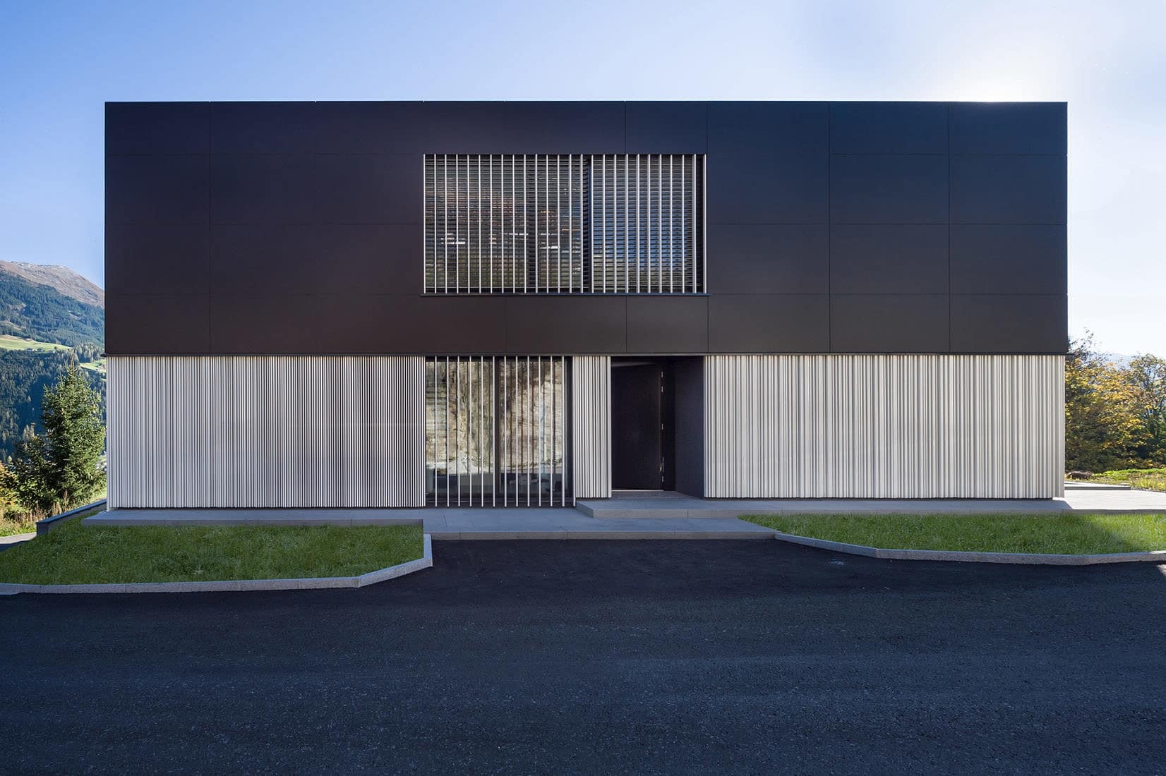 Vsi uporabljeni materiali so skrbno izbrani in ustvarjajo razkošno in sodobno podobo. Osnova zunanjosti je vlaknocementni ovoj z velikimi zastekljenimi površinami, ki so orientirane proti goram. Vse preostale tri strani fasade pa so skrbno zaščitene s fasadnimi ploščami v prevladujoči črno-beli kombinaciji in lepo zaokrožajo celoto stavbe.