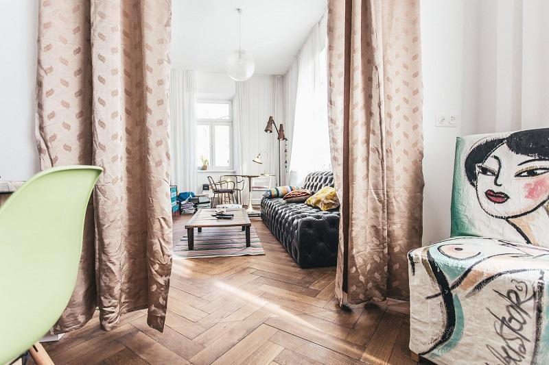 Zavese so nasploh zelo pomemben element pri opremljanju, pove Ana. Tiste, ki jih je obesila v otroški sobi, imajo še posebno zanimivo zgodbo. Dobila jih je, ko je preurejala neko berlinsko stanovanje, narejene pa so iz tkanine, ki jo je oblikoval Jean Paul Gaultier. V dnevni sobi in kuhinji so obešene prosojne svetle zavese, ki samo delno zakrivajo poglede v notranjost stanovanja. Njihova funkcija je bolj dekorativna, saj morajo v prostor spuščati čim več sončne svetlobe. Medtem ko so zavese, ki so namenjene bolj intimnim prostorom, torej spalnicam, narejene iz gosteje tkanih tkanin. Ana najraje uporabi žametne zavese, v burgundski, smaragdno zeleni ali zlati barvi. Te, kot poudari ona, prinesejo v prostor malo teatralnosti, domišljije in sanjavosti, kar pa naj bi tudi sicer bila funkcija spalnice.