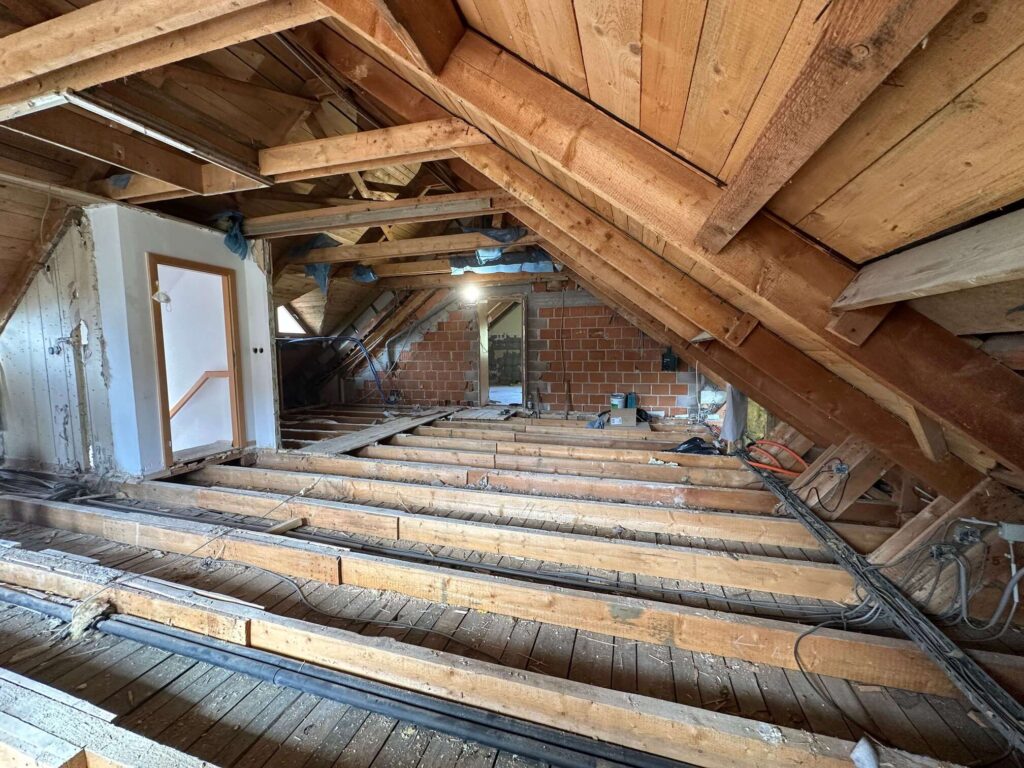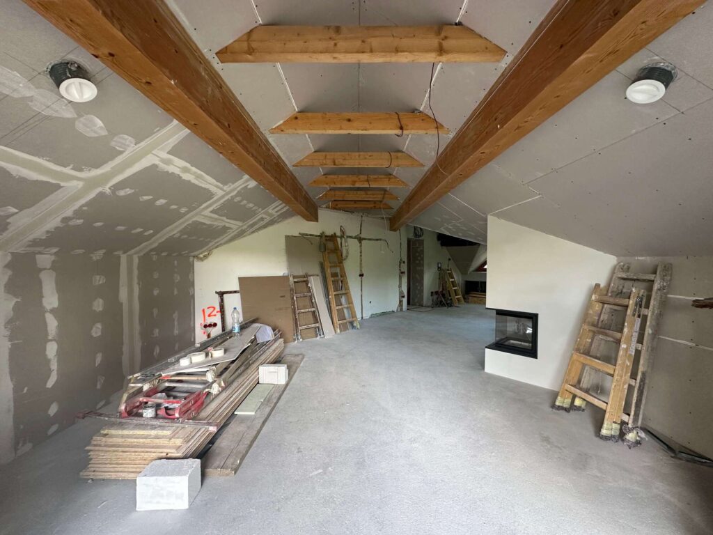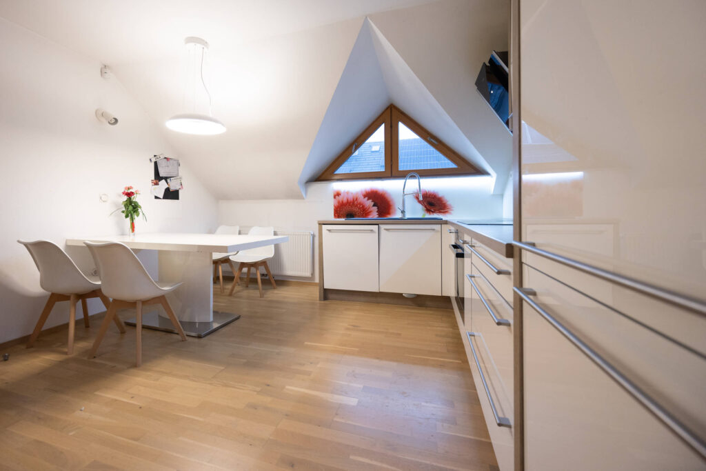 Z odstranitvijo oziroma prestavljanjem posameznih predelnih sten in z združevanjem prostorov je nastala bolj odprta bivalna zasnova. Kuhinja, jedilnica in dnevni prostor se danes povezujejo v enoten ambient, ki deluje prostorno in povezano. Pomembno vlogo pri tem ima odprtje stropov do slemena, s čimer je mansarda pridobila na zračnosti in svetlobi. Vidna lesena konstrukcija ostrešja je bila ohranjena in je postala izrazit arhitekturni element, ki prostoru dodaja toplino in značaj.