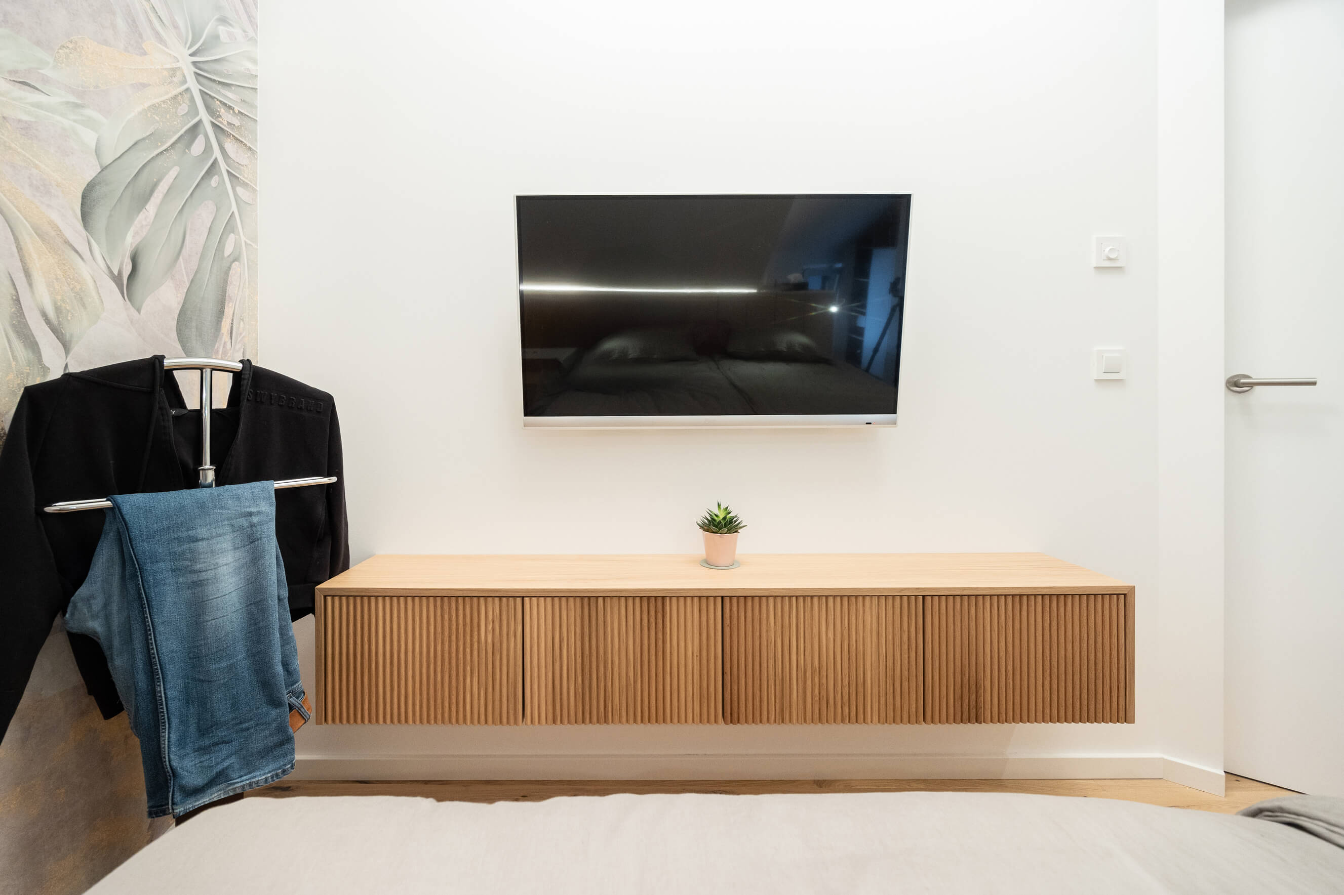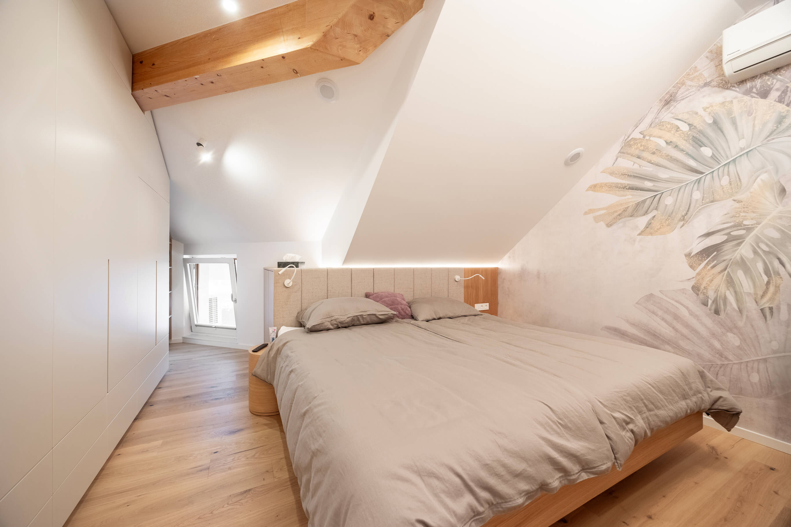 Interjer temelji na svetlih, nevtralnih tonih, ki prostor optično povečajo in mu dajejo občutek zračnosti. Leseni elementi se ponavljajo v različnih delih stanovanja in prostoru dodajajo toplino ter občutek domačnosti. Barvni poudarki so uporabljeni zadržano in premišljeno, predvsem v tekstilu in posameznih kosih opreme. Večina pohištva je izdelana po meri in prilagojena mansardni geometriji ter nižjim delom prostora, kar omogoča učinkovito izrabo površine in urejen videz interjerja.