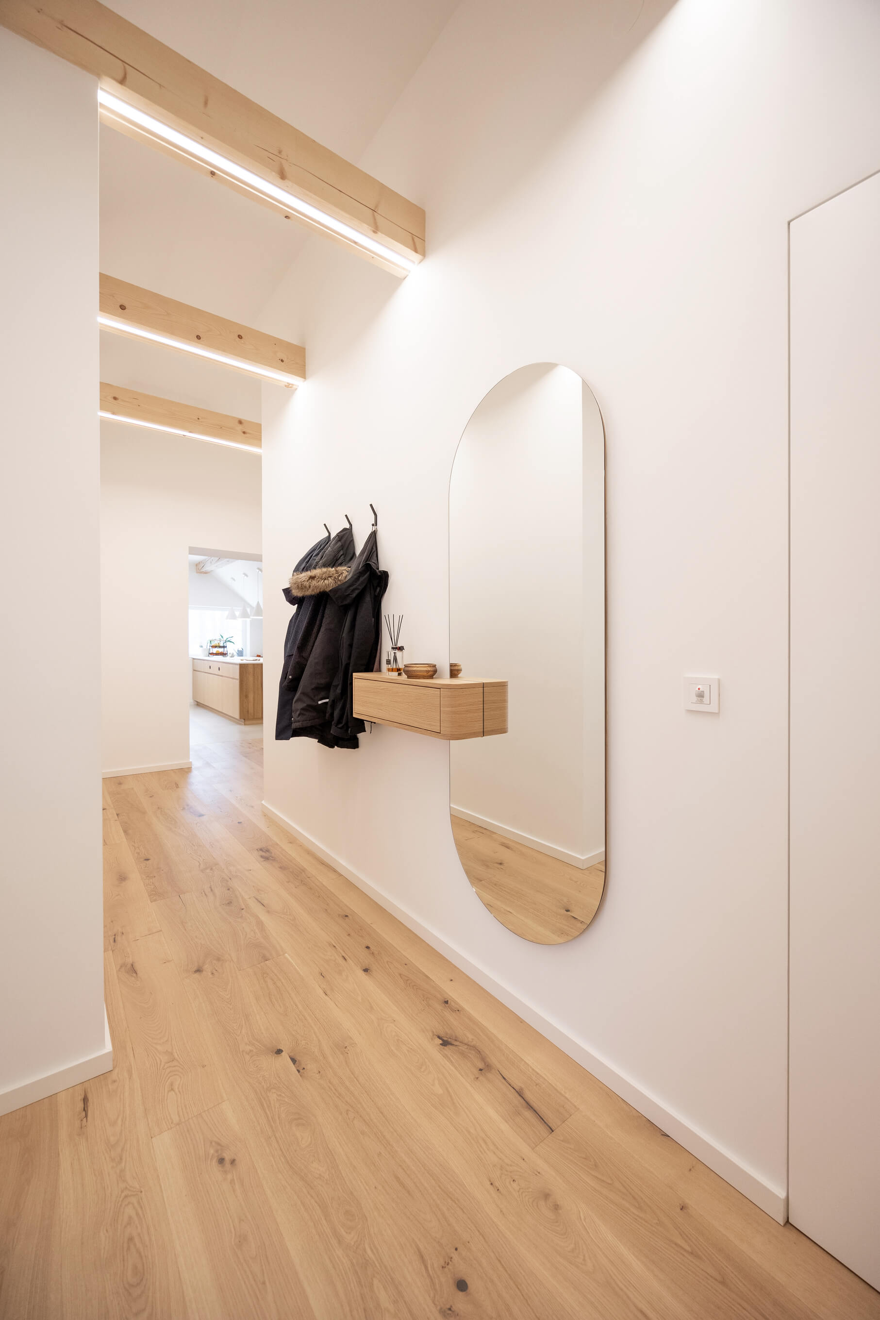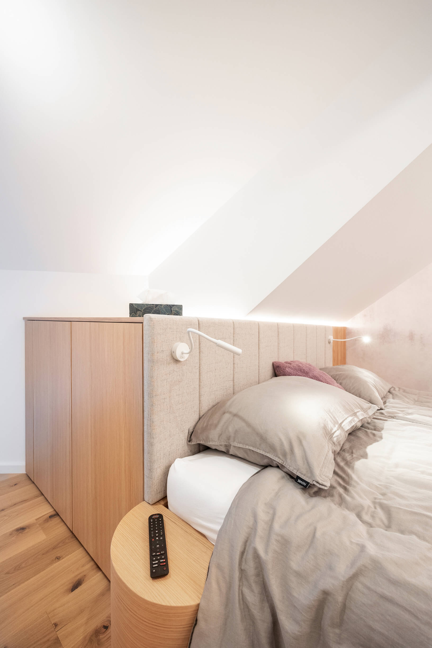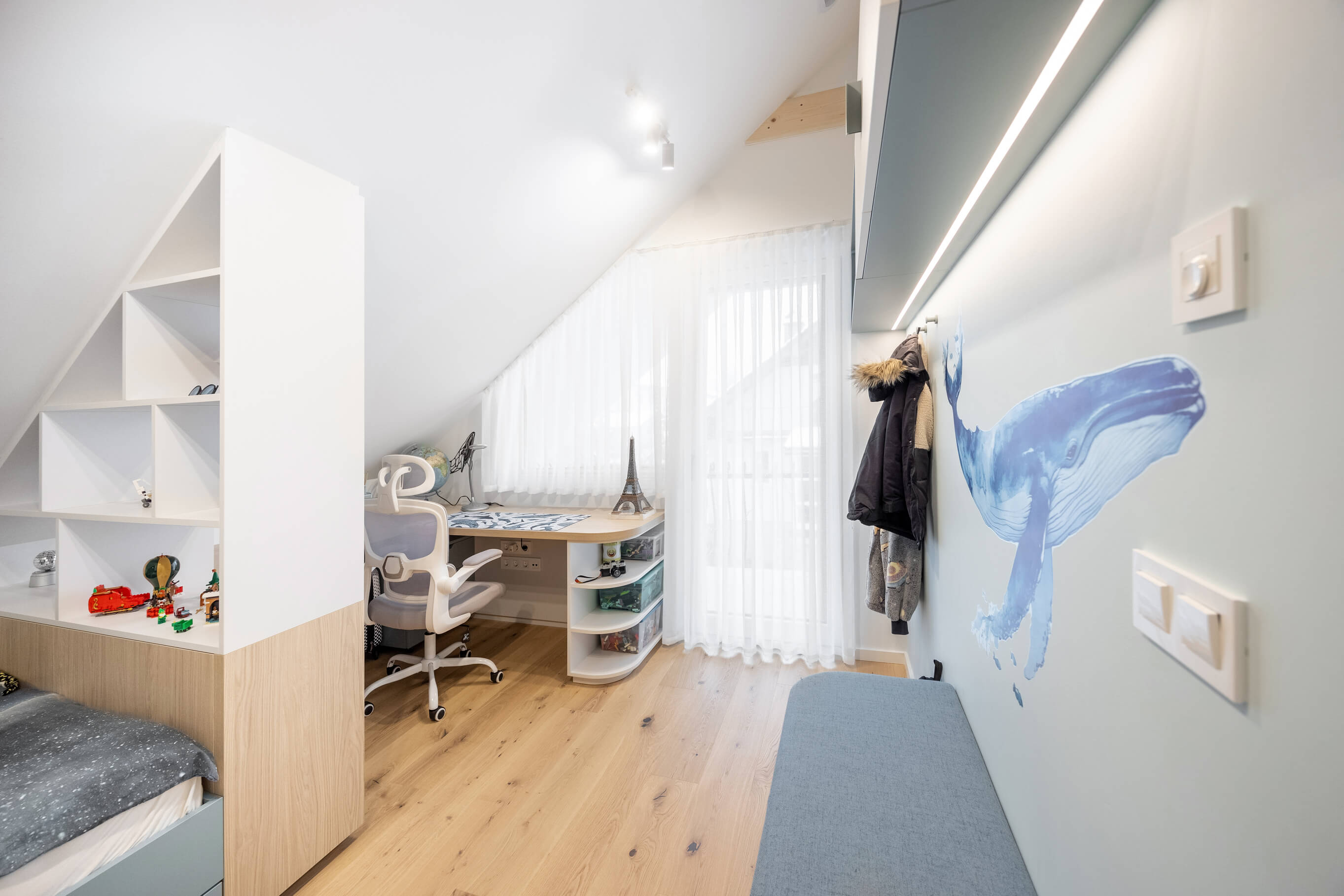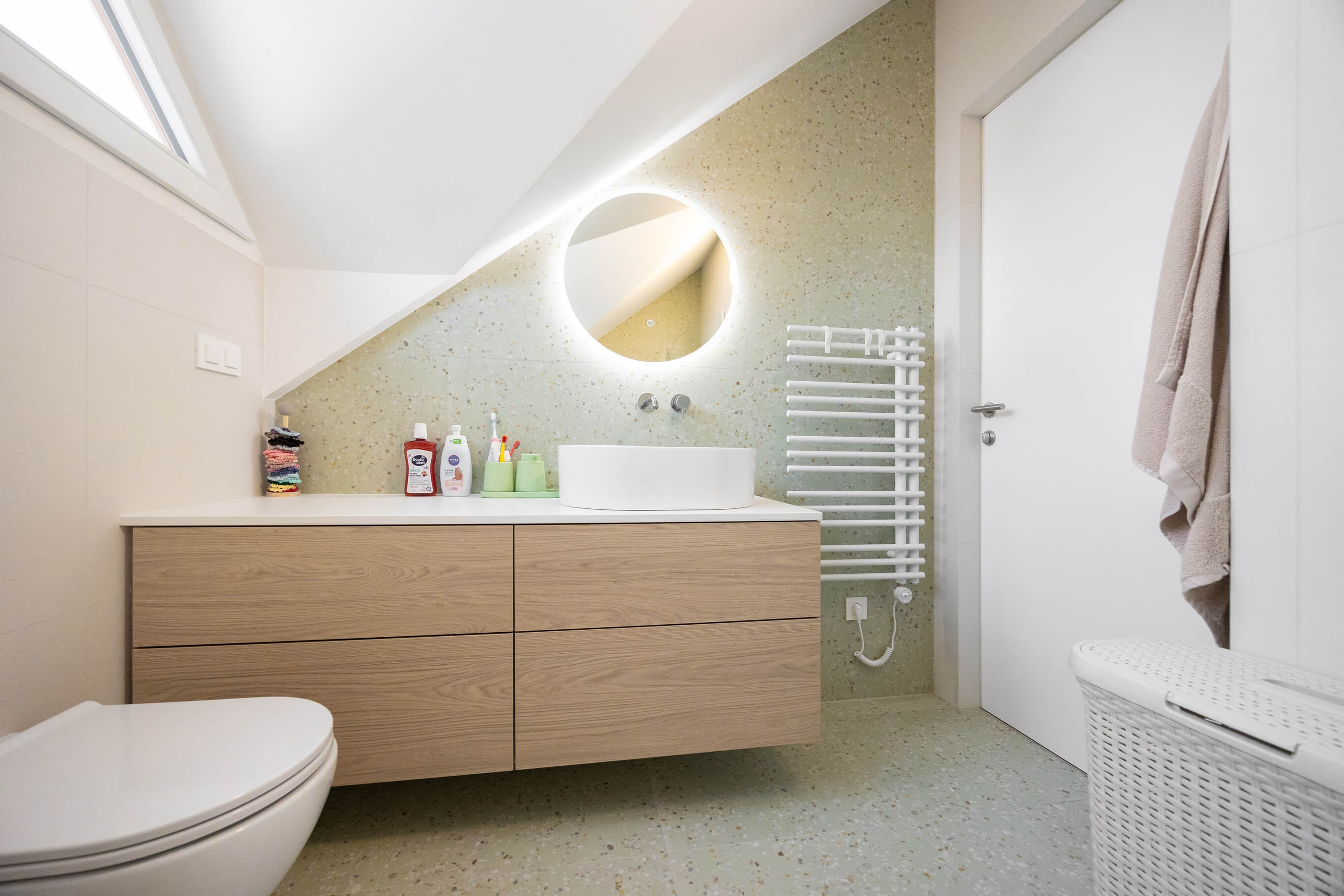 Prenova mansarde ni bila usmerjena v posamezne izstopajoče poudarke, temveč v ustvarjanje usklajene in smiselno zasnovane celote. Rezultat je svetel, pregleden in topel dom, ki spoštuje danosti prostora in jih s premišljenimi rešitvami nadgradi v sodobno bivalno okolje, prilagojeno potrebam družine.