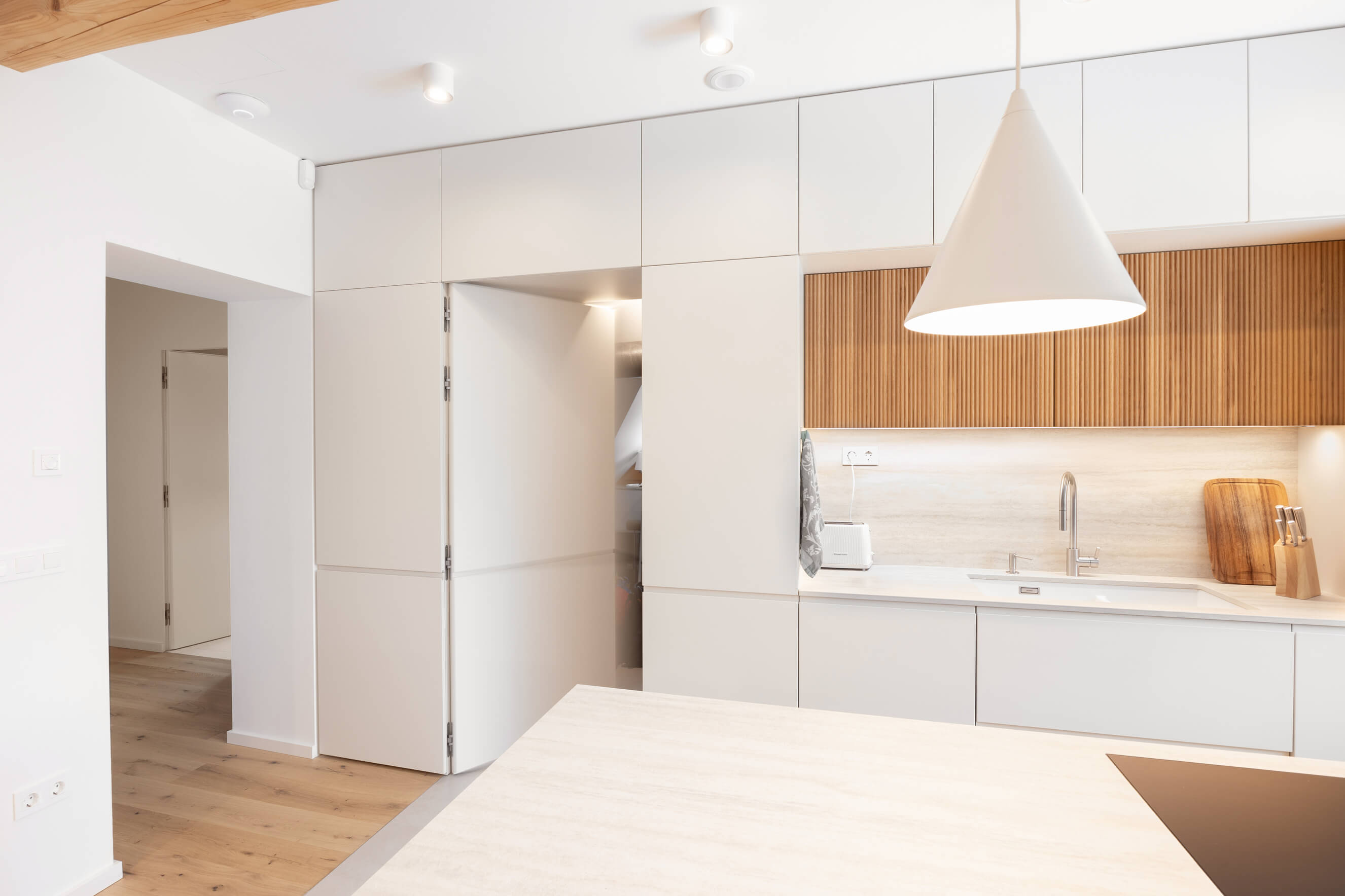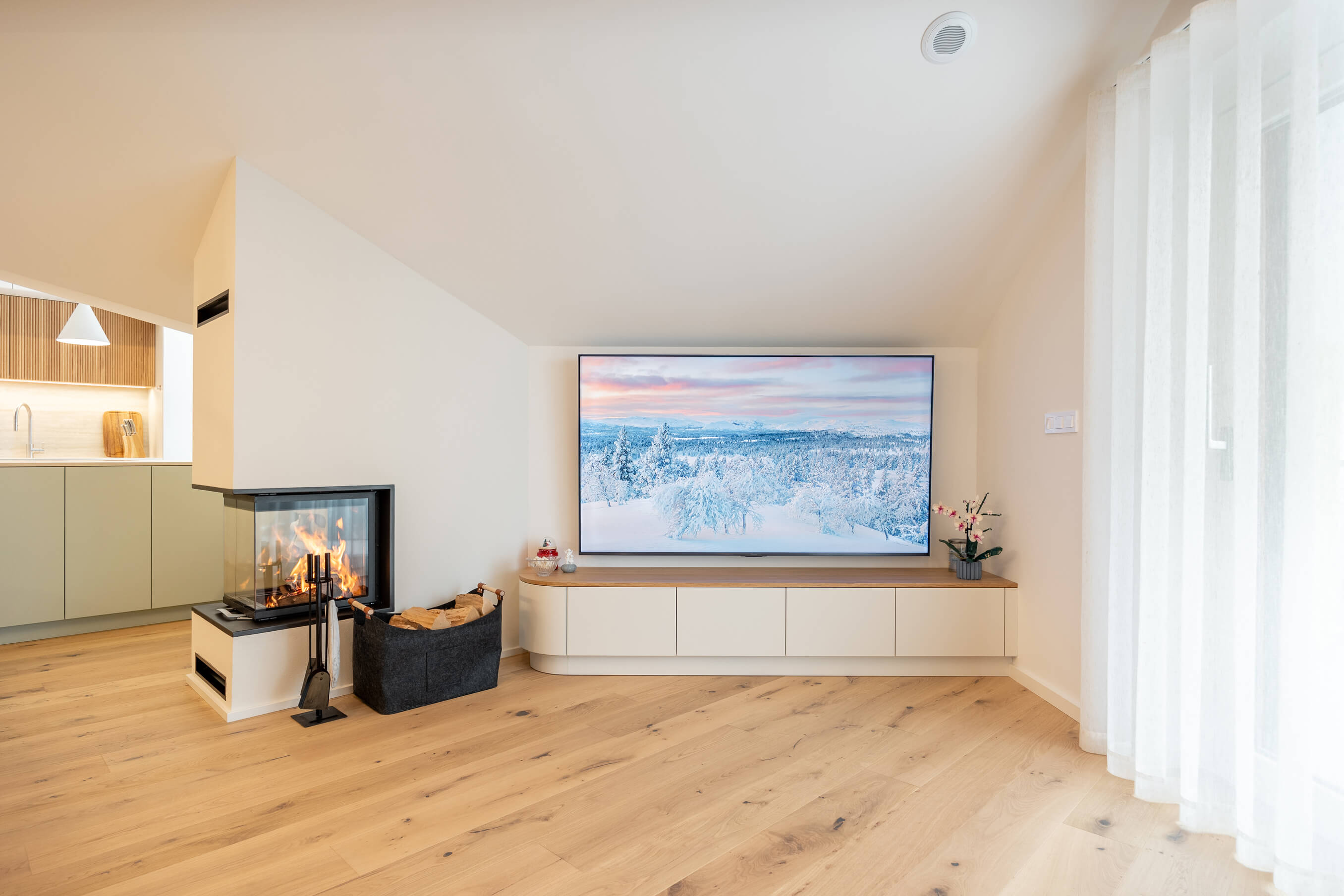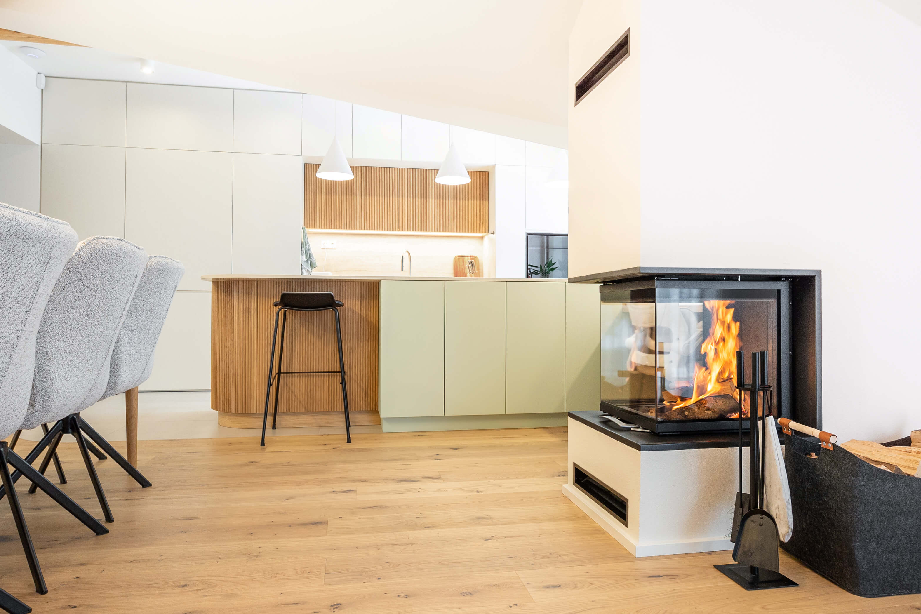 Posebna pozornost je bila namenjena shranjevalnim rešitvam, ki so diskretno vključene v arhitekturo prostora in delujejo kot njen naravni del. Kamin v osrednjem bivalnem prostoru deluje kot mirno središče doma in dodatno prispeva k občutku topline. Zasebni prostori – spalnica, otroški sobi in kopalnice – sledijo enaki oblikovni logiki, z umirjenimi materiali, jasnimi linijami in poudarkom na funkcionalnosti.