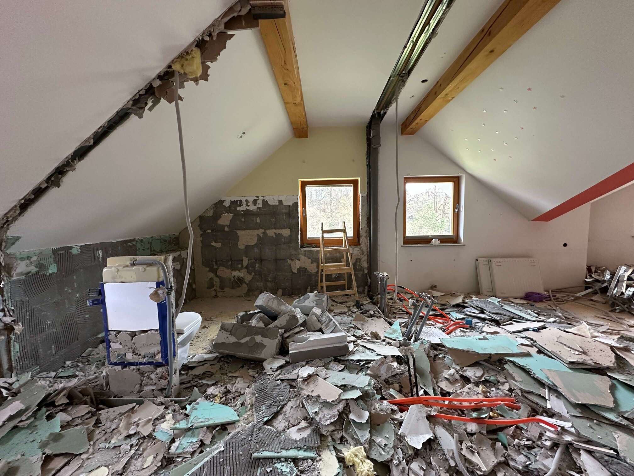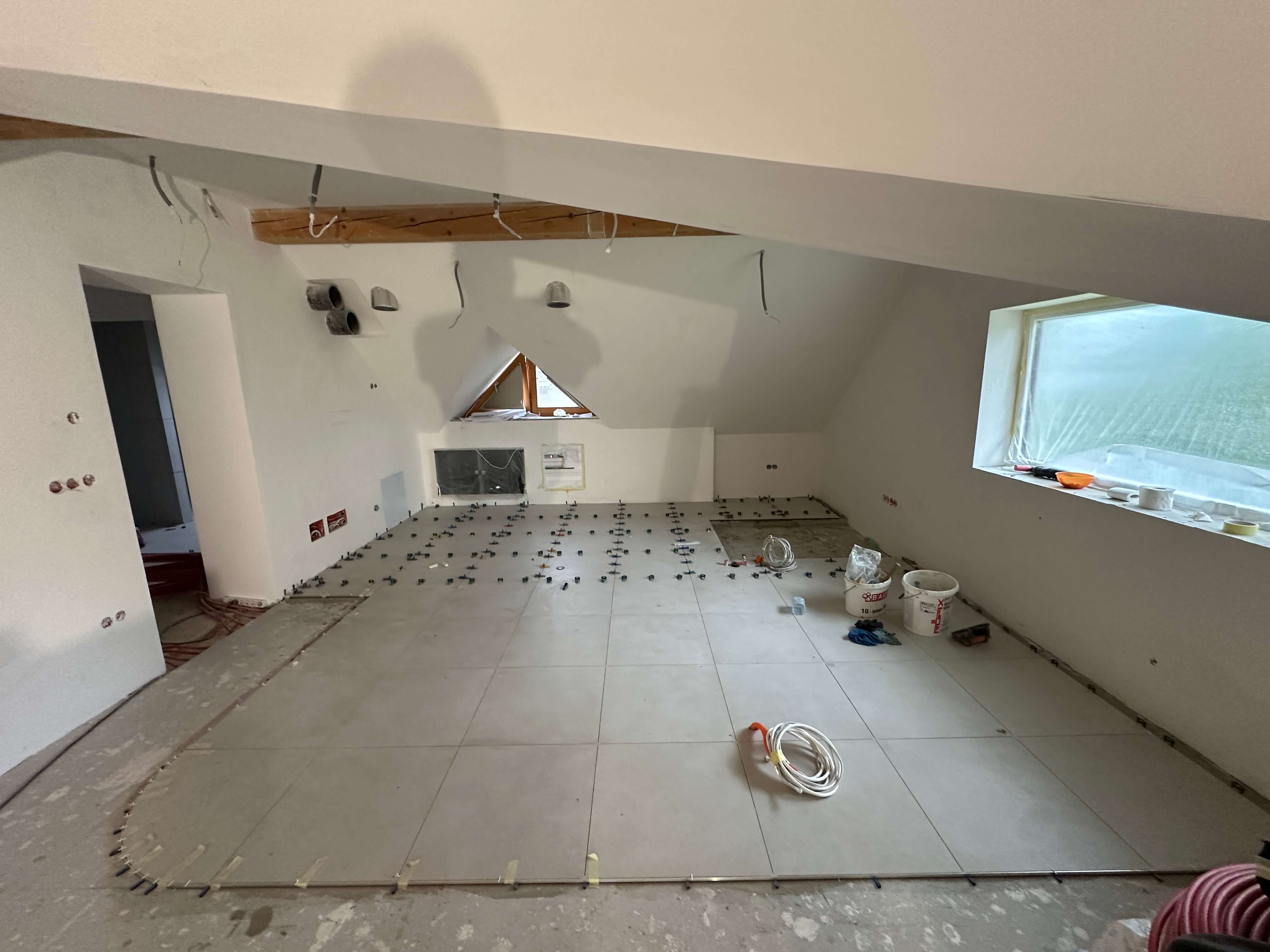 Z odstranitvijo oziroma prestavljanjem posameznih predelnih sten in z združevanjem prostorov je nastala bolj odprta bivalna zasnova. Kuhinja, jedilnica in dnevni prostor se danes povezujejo v enoten ambient, ki deluje prostorno in povezano. Pomembno vlogo pri tem ima odprtje stropov do slemena, s čimer je mansarda pridobila na zračnosti in svetlobi. Vidna lesena konstrukcija ostrešja je bila ohranjena in je postala izrazit arhitekturni element, ki prostoru dodaja toplino in značaj.