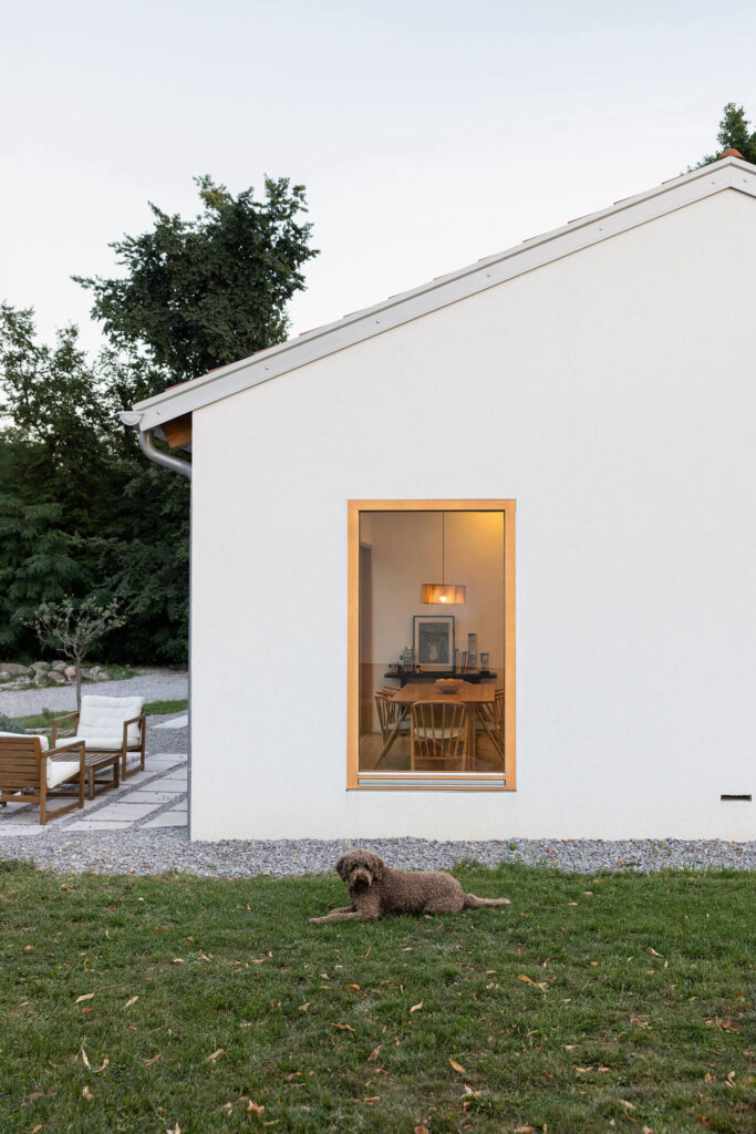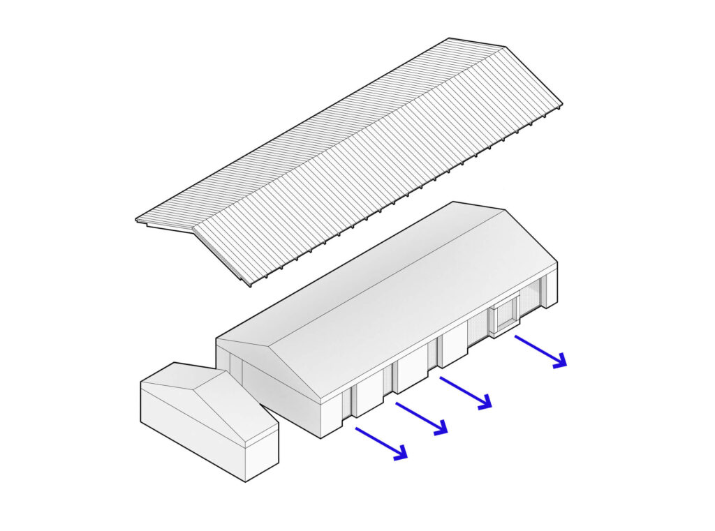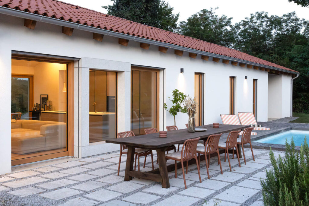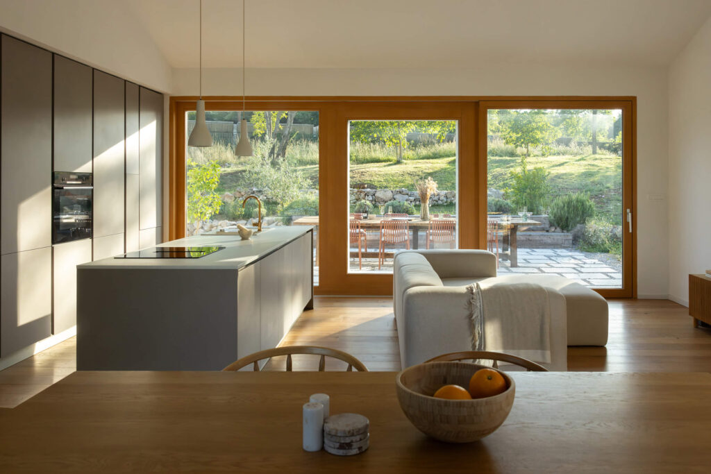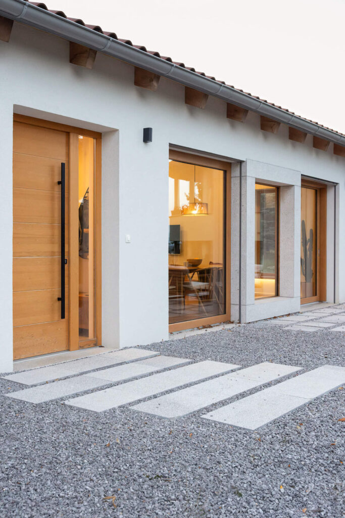 Osnovni podolgovati volumen je razčlenjen na dva dela, združena pod enotno streho iz tradicionalnih opečnatih korcev. En del služi kot shramba, v drugem so bivalni prostori. Med njima sta nadstrešek za avtomobil in servisni vhod. Poseben poudarek predstavlja sodobna reinterpretacija kamnite jerte, ki razčleni veliko panoramsko zasteklitev na obeh straneh hiše. Jerta je postavljena v os središča in deluje kot spomin na tradicionalni element ter služi kot udobna klop za druženje. Dnevni bivalni prostor je na skrajnem koncu objekta odprt na tri strani in s prostim ostrešjem, kar ustvarja občutek zračnosti in prostornosti.