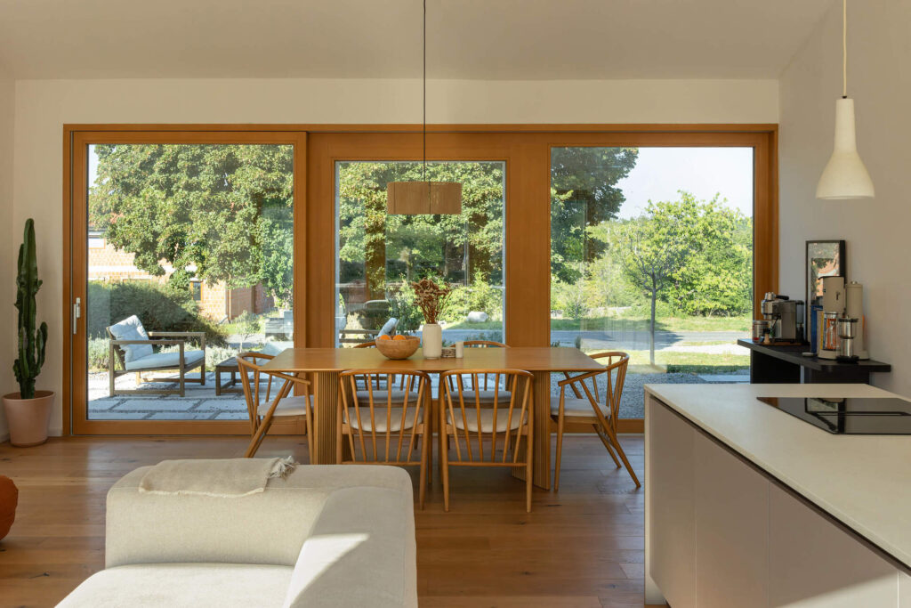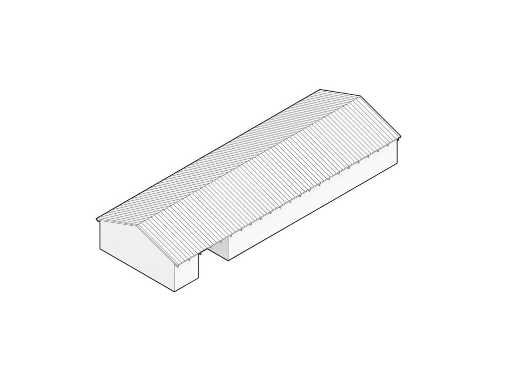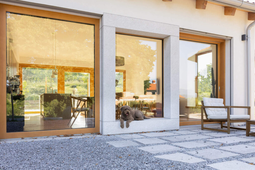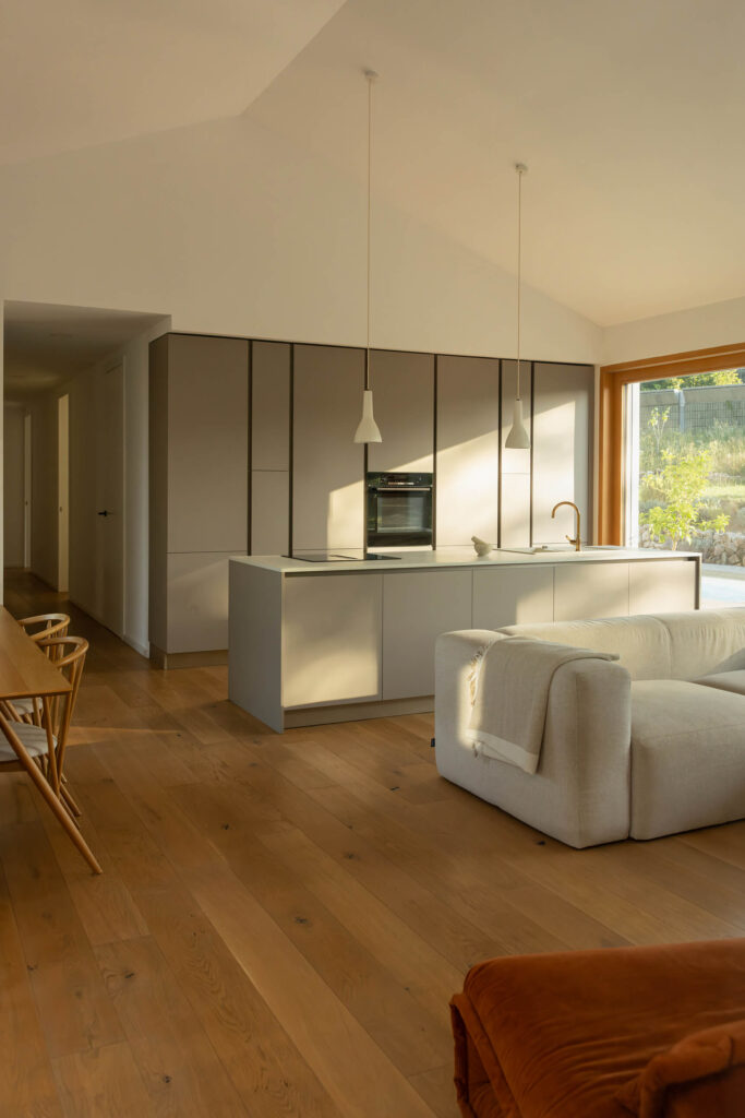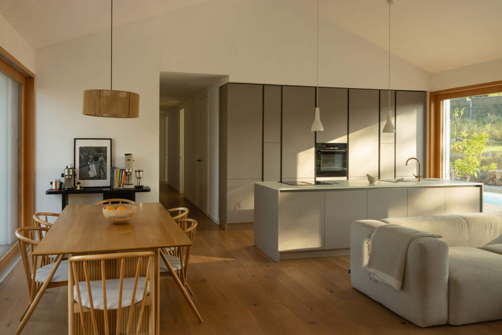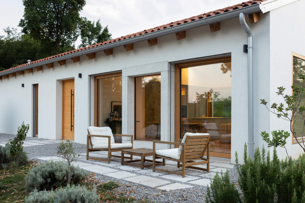 Osnovni podolgovati volumen je razčlenjen na dva dela, združena pod enotno streho iz tradicionalnih opečnatih korcev. En del služi kot shramba, v drugem so bivalni prostori. Med njima sta nadstrešek za avtomobil in servisni vhod. Poseben poudarek predstavlja sodobna reinterpretacija kamnite jerte, ki razčleni veliko panoramsko zasteklitev na obeh straneh hiše. Jerta je postavljena v os središča in deluje kot spomin na tradicionalni element ter služi kot udobna klop za druženje. Dnevni bivalni prostor je na skrajnem koncu objekta odprt na tri strani in s prostim ostrešjem, kar ustvarja občutek zračnosti in prostornosti.
