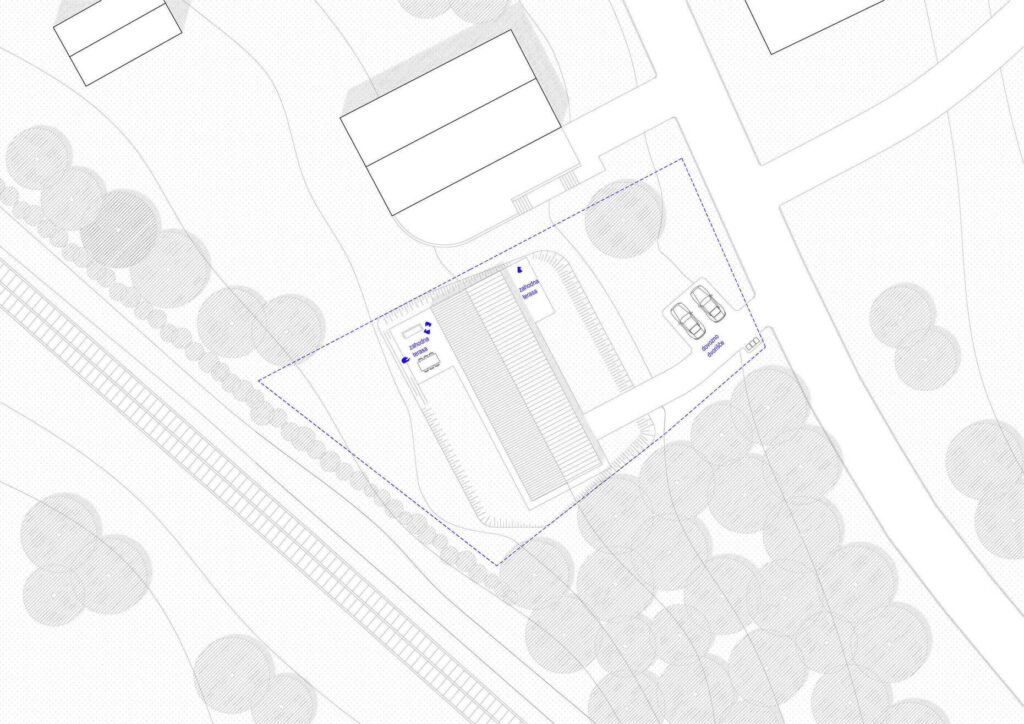 Hiša je oblikovana kot podolgovat volumen, umeščen vzporedno s terenom. Tako je parcela razdeljena na dva značaja: javno stran proti cesti in intimnejše zasebno dvorišče. Proti cesti so vhod in servisni prostori, proti dvorišču pa spalnice, medtem ko se dnevni prostor nahaja na vogalu hiše in je orientiran na tri strani. Objekt je preudarno vpet v rahlo padajoč teren, zato so bili zemeljski izkopi minimalni, dostop z avtomobilom in zunanje bivalne površine pa naravno speljani. Okolica je utrjena s suhim opornim zidom, ki zamejuje teraso in dopolnjuje sonaravno ureditev okolice.