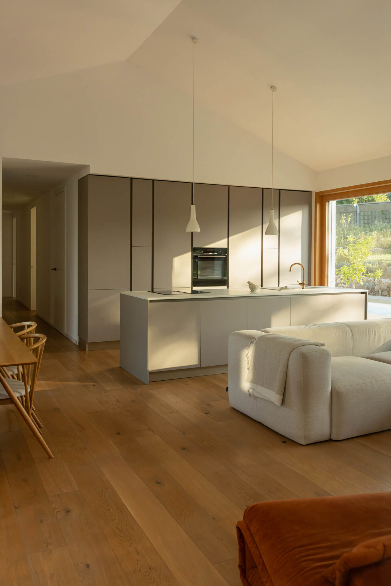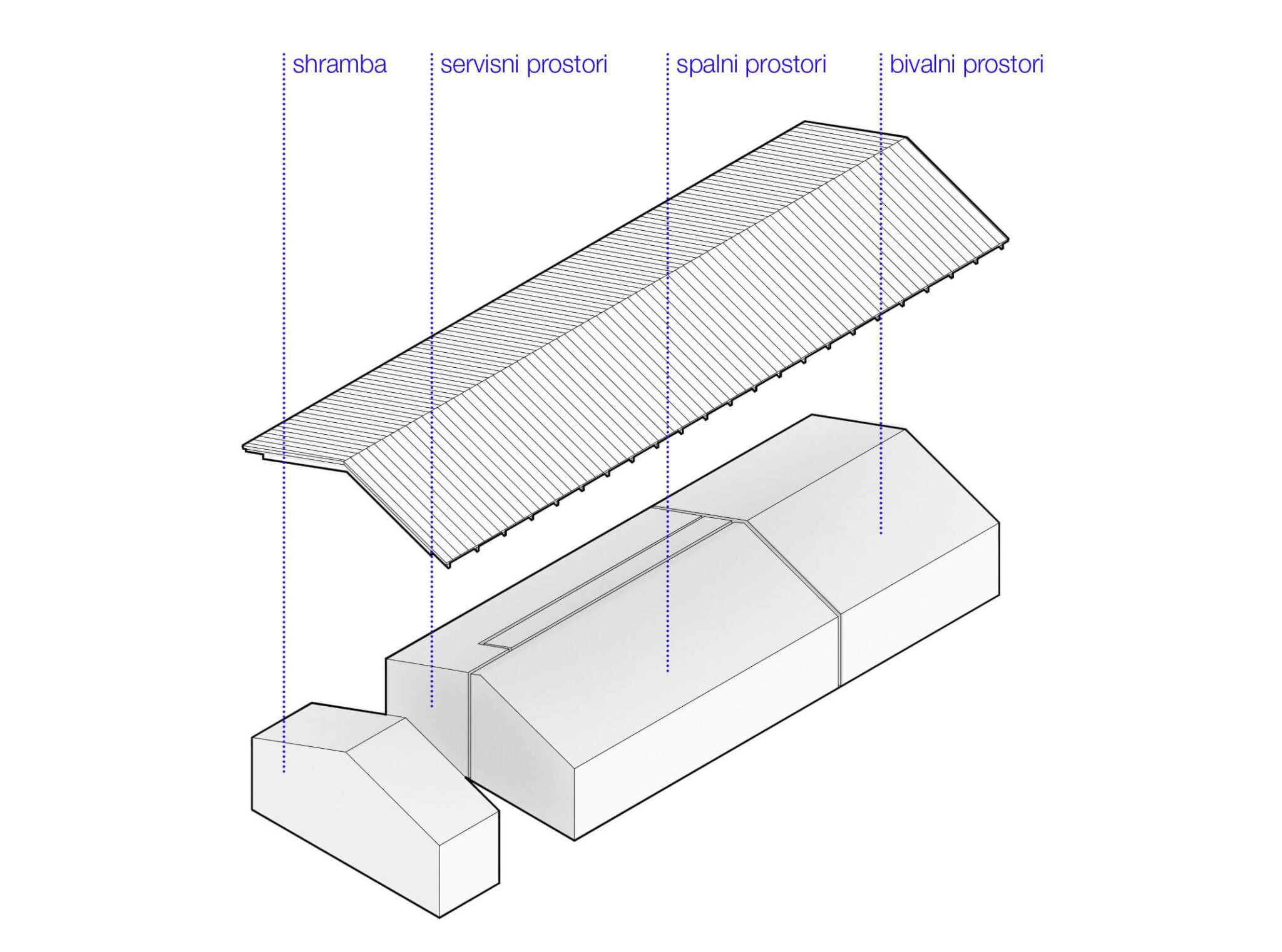 Osnovni podolgovati volumen je razčlenjen na dva dela, združena pod enotno streho iz tradicionalnih opečnatih korcev. En del služi kot shramba, v drugem so bivalni prostori. Med njima sta nadstrešek za avtomobil in servisni vhod. Poseben poudarek predstavlja sodobna reinterpretacija kamnite jerte, ki razčleni veliko panoramsko zasteklitev na obeh straneh hiše. Jerta je postavljena v os središča in deluje kot spomin na tradicionalni element ter služi kot udobna klop za druženje. Dnevni bivalni prostor je na skrajnem koncu objekta odprt na tri strani in s prostim ostrešjem, kar ustvarja občutek zračnosti in prostornosti.