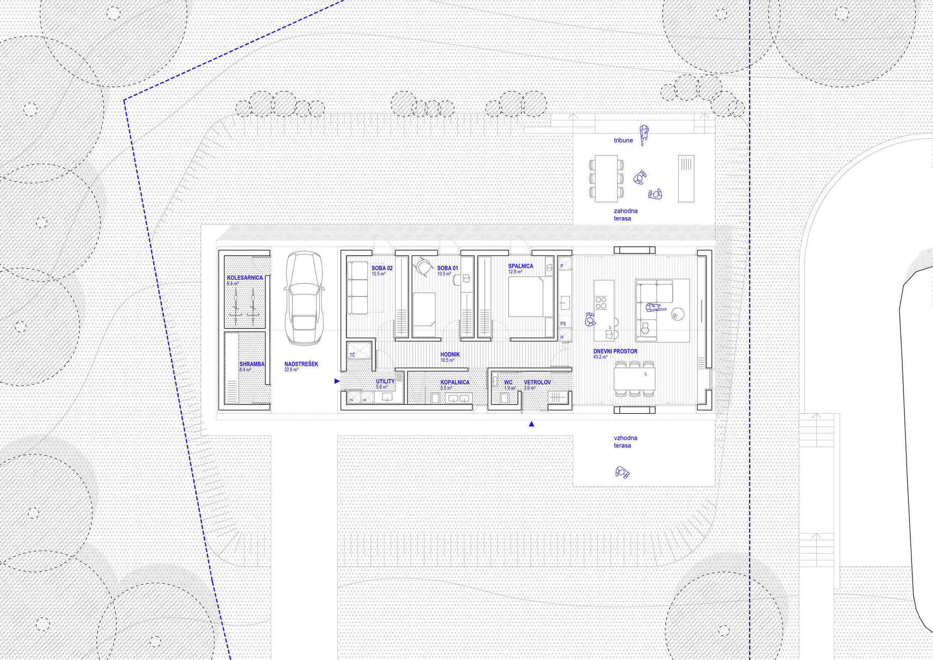 Hiša je oblikovana kot podolgovat volumen, umeščen vzporedno s terenom. Tako je parcela razdeljena na dva značaja: javno stran proti cesti in intimnejše zasebno dvorišče. Proti cesti so vhod in servisni prostori, proti dvorišču pa spalnice, medtem ko se dnevni prostor nahaja na vogalu hiše in je orientiran na tri strani. Objekt je preudarno vpet v rahlo padajoč teren, zato so bili zemeljski izkopi minimalni, dostop z avtomobilom in zunanje bivalne površine pa naravno speljani. Okolica je utrjena s suhim opornim zidom, ki zamejuje teraso in dopolnjuje sonaravno ureditev okolice.
