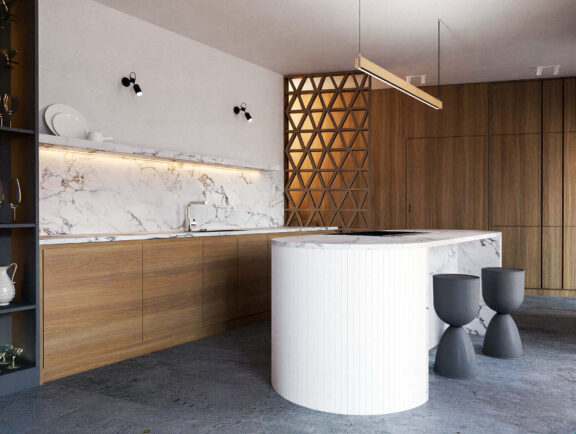 Kuhinja, skrita za prozornimi drsnimi vrati, sledi konceptu beline in mehkobe, ki prežema celotno hišo. Lastnik, strasten kuhar, je želel zagotoviti, da vonjave ne bi zapustile kuhinje, zato so vrata zrakotesna. Kuhinjski prostor dopolnjujejo štiri monumentalne porcelanaste kocke, oblečene v teksturo kamna, in markantne svetilke, ki visijo nad kuhinjskim otokom. Tudi te so delo oblikovalskega studia Mahkhno Studio.