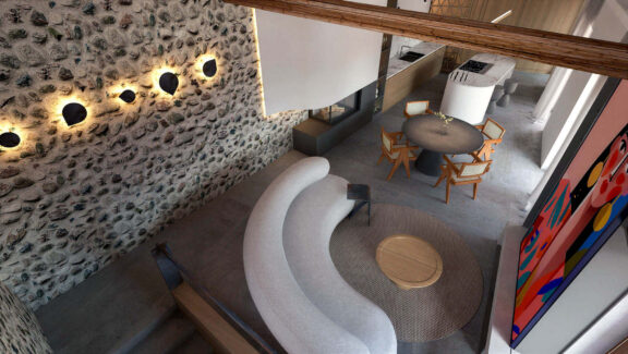 Stene in stropi hiše so oblikovani v zaobljene linije, podobno kot stranice marelice. Ta organska oblika je arhitektom in izvajalcem predstavljala precejšen izziv, saj so morali ustvariti natančne kroje, po katerih so mojstri izrezali in montirali mavčne plošče. Rezultat je popolna harmonija med obliko in funkcionalnostjo, ki izžareva prefinjeno estetiko.