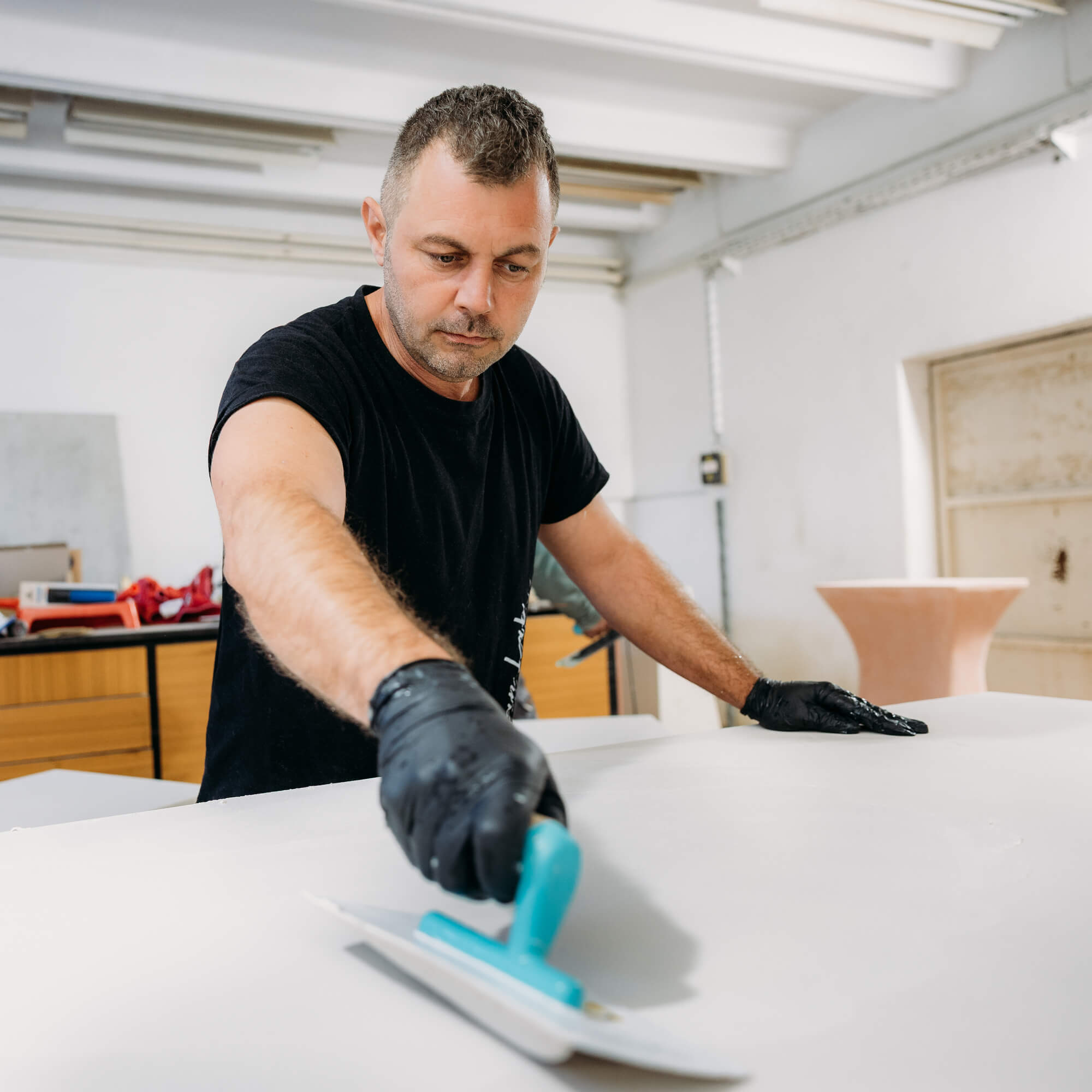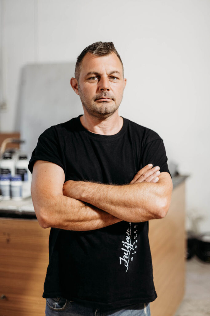 Mitja, po izobrazbi sicer diplomirani ekonomist, se že več kot petnajst let giblje v gradbeništvu, kjer se je izučil razumevati materiale, konstrukcije in procese, ki še danes pomembno zaznamujejo njegov pristop k delu. V prostem času ga je privlačilo ustvarjanje in preizkušanje materialov, še posebej ga je očaral mikrocement, ki ga ni pritegnil kot trend, temveč kot material z resno izrazno močjo. Z njim se je začel razvoj jezika, ki ga danes v svet pošilja z izdelki Julijan Lab. V njem namreč vidi prostor za tišino, prisotnost in osebno avtorsko govorico.