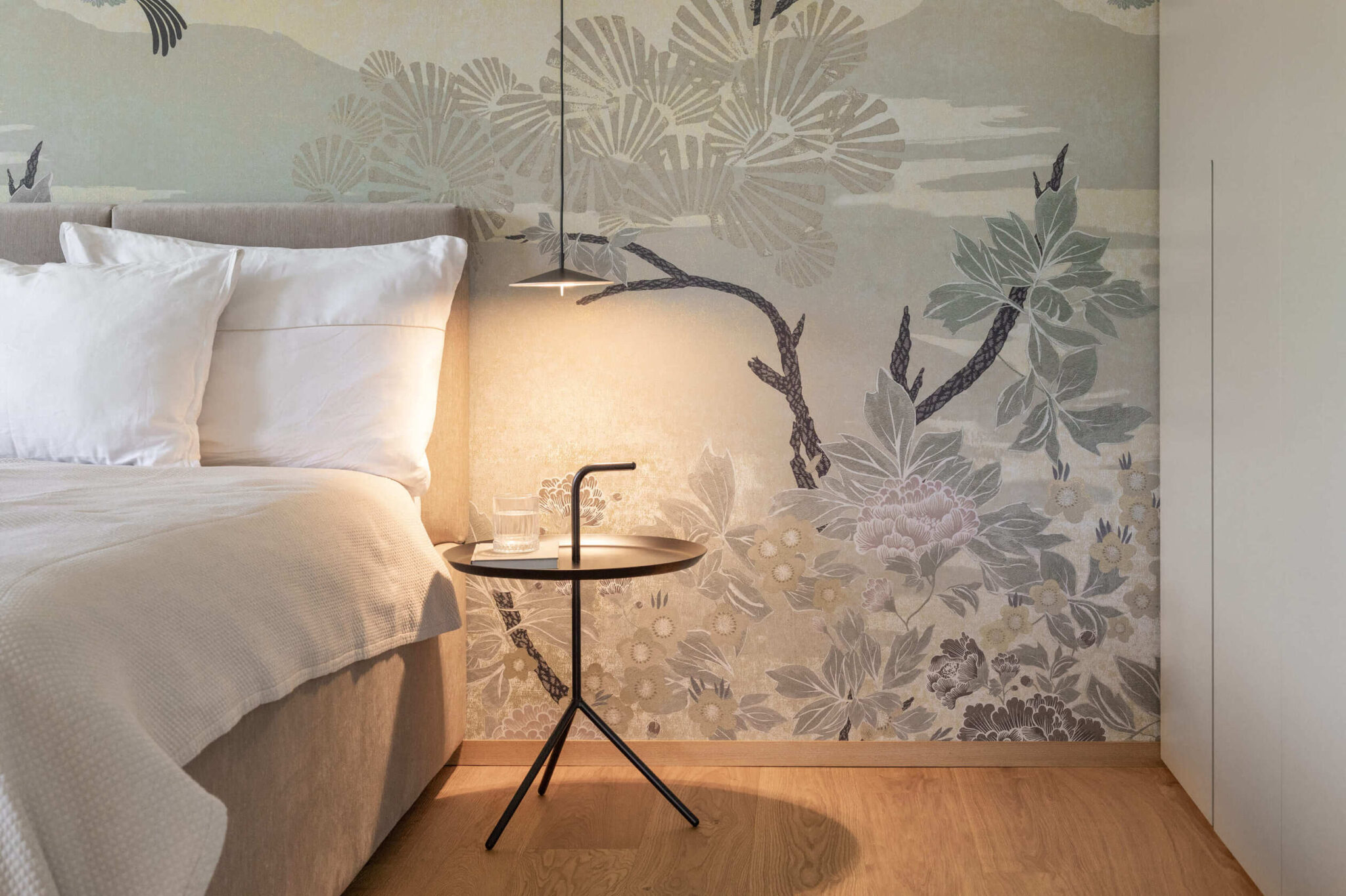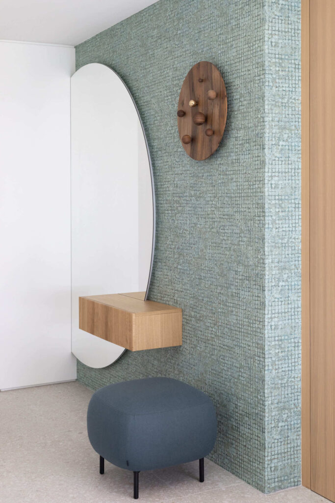 Vidna lesena konstrukcija je narekovala nevpadljivo barvno osnovo, le s posamičnimi barvnimi poudarki: kuhinjski otok je rdeč, omara v spalnici pa turkizna. Kopalnici sta v modrih odtenkih, tapeta v vhodnem prostoru je zelena, prav tako dnevni WC. V spalnici pritegne pogled tapeta z japonskim motivom.