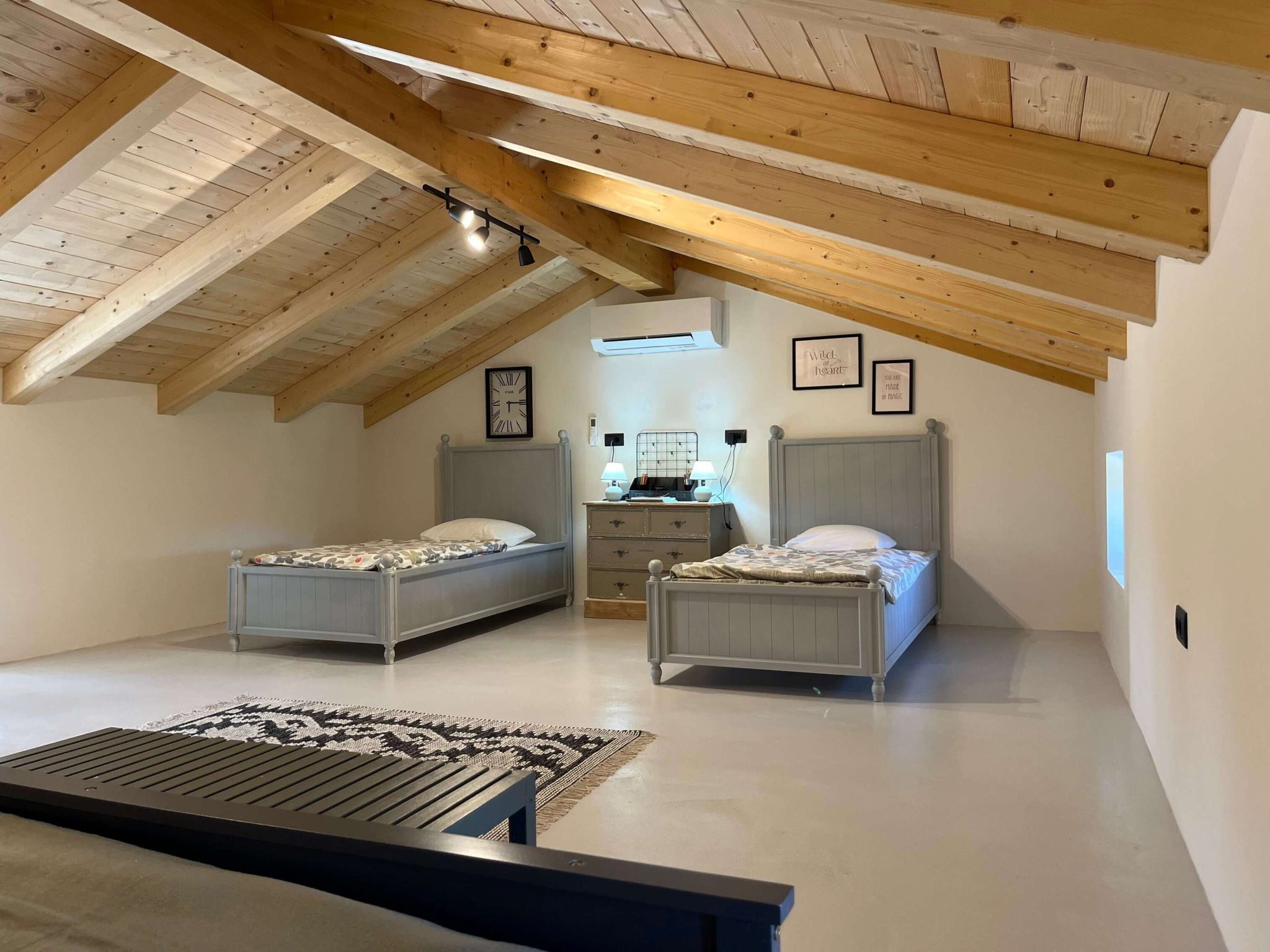 Hiša z 200 m2 uporabne površine sicer na prvi pogled deluje manjša, a je zahvaljujoč nekaterim manjšim posegom v prostor postala še bolj prostorna in odprta. Poleg dveh spalnic in kopalnic ima tudi eno stranišče, medtem ko je v zgornji del starejšega kamnitega okostja preurejen v ‘družinsko sobo’ z zakonsko posteljo in dvema enojnima posteljama. Zahvaljujoč temu lahko v hiši biva kar osem ljudi. Tudi kopalnice v črno-beli kombinaciji se prostorne in svetle.