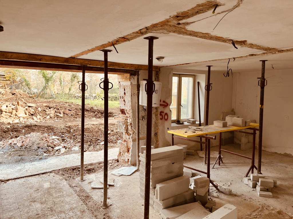 Vhodni del hiše je kamnit, nato pa so že prejšnji lastniki na strani proti vrtu naknadno dozidali še prizidek. Da bi tega posodobila, so poševno streho, ki je prej pokrivala prizidek, nadomestili z ravno, s čimer se je prizidek preobrazil v sodoben kubus, medtem ko so ostrešje nad prvim delom objekta le zamenjali. A tudi tu brez težav ni šlo.
