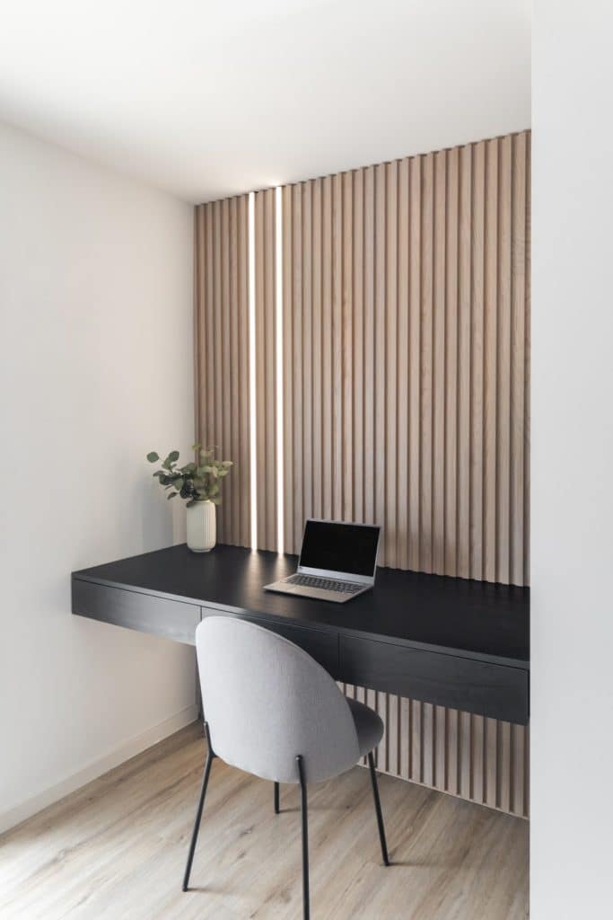 Prvotno je bil dnevni prostor ločen od jedilnega prostora s kuhinjo, kar je bilo ob obiskih sila nepraktično. Poleg tega sta bila dva manjša prostora, v skupni izmeri 20 m2, povsem neuporabna, kar so želeli s prenovo spremeniti. Arhitekt je zasnoval rešitev odprtega tlorisa, predvidel rušitev dveh nenosilnih sten in s tem prostoru omogočil, da zadiha. Podaljšek dnevnega prostora je delovni kotiček, umeščen na prehod med otroškima sobama z izhodom na dvorišče.