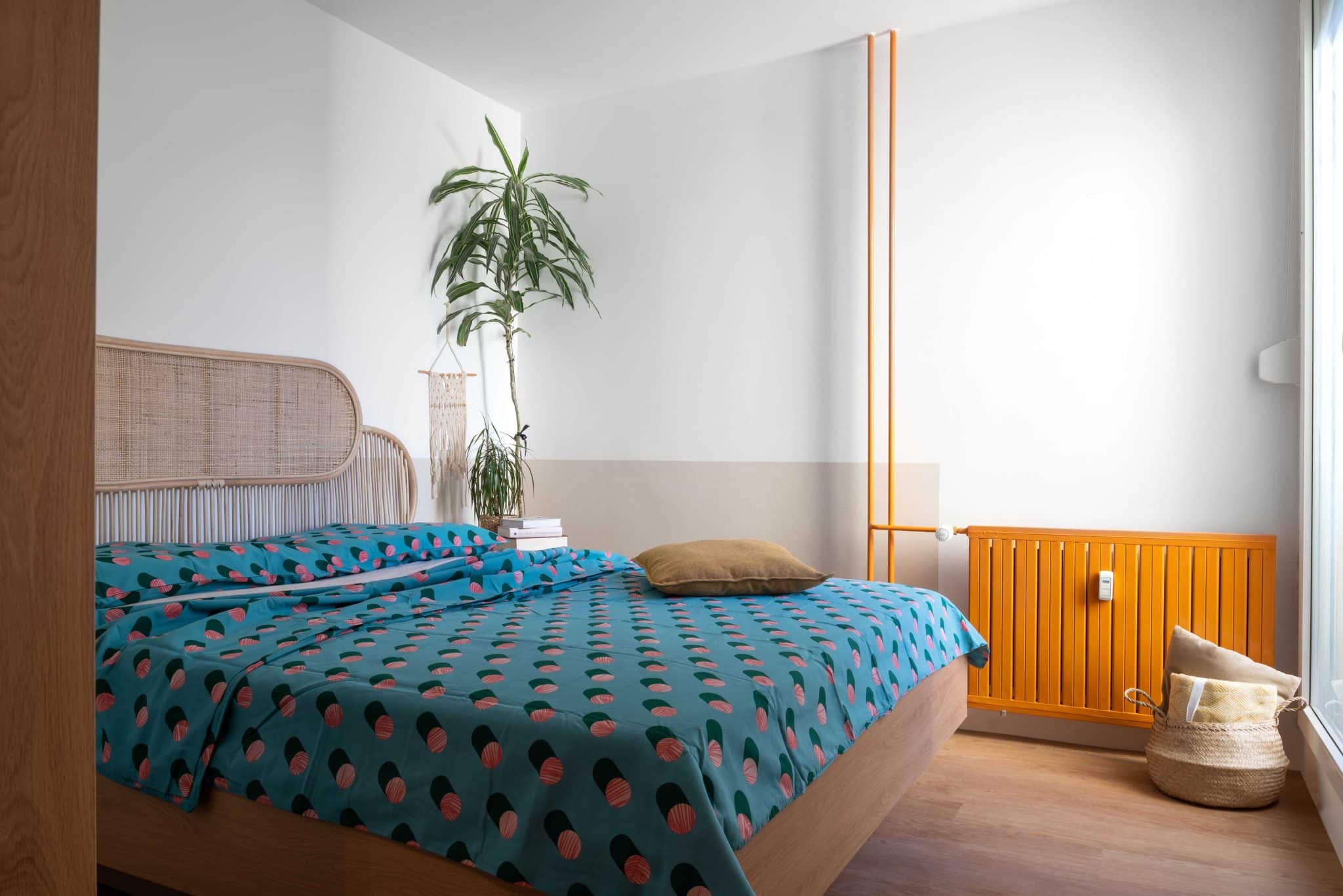 Posebno vlogo v stanovanju igrajo tudi barve: poleg že omenjenih oranžne in turkizne se na steni iz prostora v prostor povezujejo različni liki – polkrogi in pravokotniki – v rumeni in bež barvi. Ti liki dopolnjujejo kompozicijo opreme, povezujejo prostore in ustvarjajo zanimive optične iluzije.