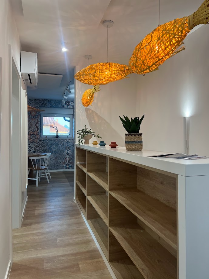 Zgornje stanovanje je malenkost večje, meri dobrih 65 kvadratnih metrov, saj vključuje tudi vertikalni del oziroma stopnišče. Takoj ob vstopu v nadstropje je na levi strani kopalnica, nato sledita spalnica in otroška soba. Skozi hodnik ob stopnišču se vstopi v osrednji bivalni prostor. Ta je enako kot v spodnjem stanovanju: odprt ter združuje kuhinjo, jedilnico in dnevno sobo. Tudi tu najprej opazimo markantno tapeto, ki je obenem narekovala tudi modro kuhinjo. V hodniku so nad stopniščem nameščene zanimive svetilke iz pletenega trsja, ki imajo obliko rib. Zaradi slednjih in sinje modre kuhinje ima to stanovanje počitniški karakter, njegova največja prednost pa je ta, da so vse sobe povezane z dolgim balkonom, velikim približno 17 kvadratnih metrov.