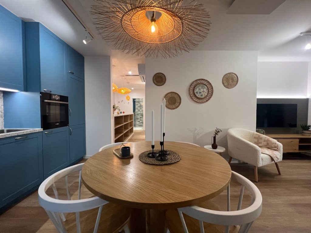 Sledi osrednji prostor, v katerem so združene odprta kuhinja, jedilnica in dnevna soba. Ta prostor je opremljen v umirjenih sivo-rjavih odtenkih, tapeta nasproti jedilne mize pa je ponovno lovilka pogledov.