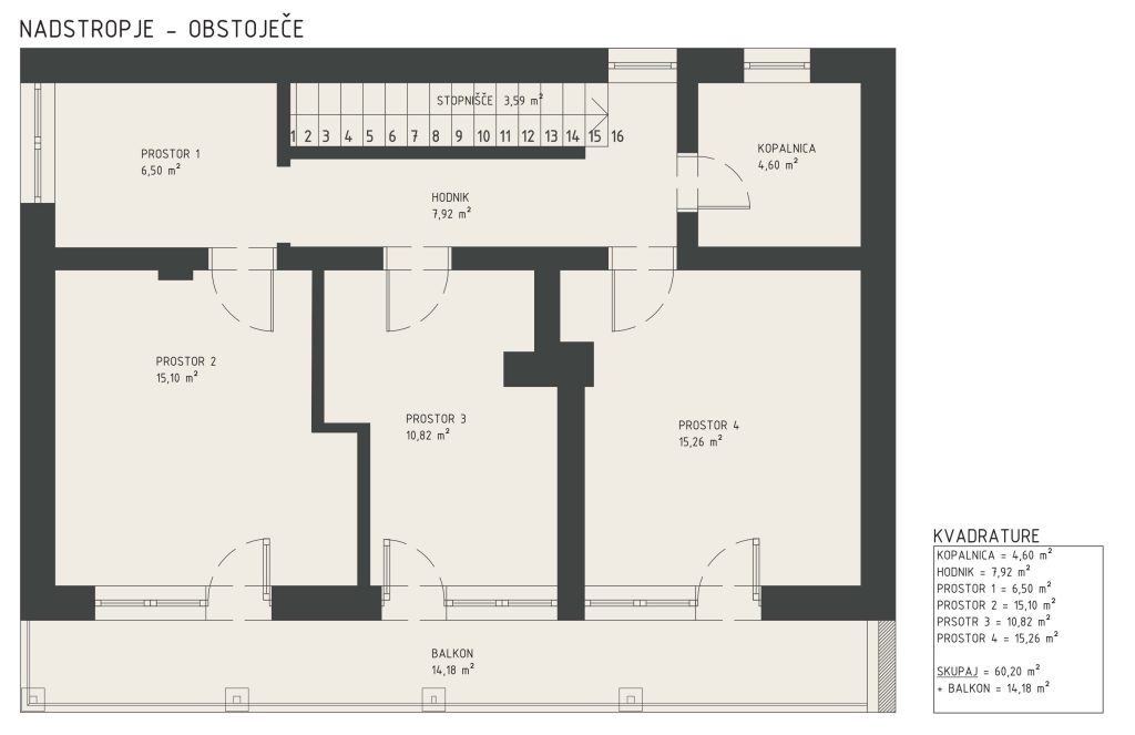 - Površina trisobnega stanovanja v nadstropju: stanovanje 62 m2, balkon 14 m2