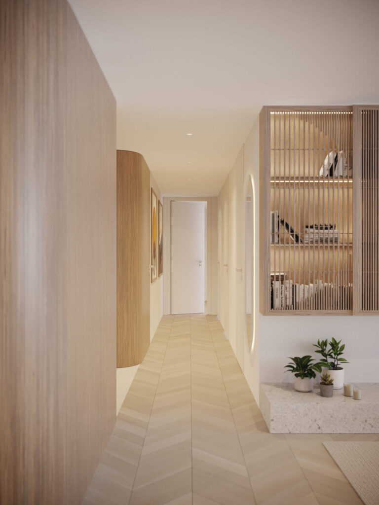 Lastnika in arhitektki so se posvetili vsem prostorom, ki sestavljajo stanovanje: bivalni prostor, kuhinja, shramba, predsoba, dnevni WC oz. mala kopalnica, otroška soba, spalnica z garderobo in master kopalnica, domača pisarna ter pralnica. Površina stanovanja znaša 135 kvadratnih metrov, dopolnjuje ga še res prostorna terasa.
