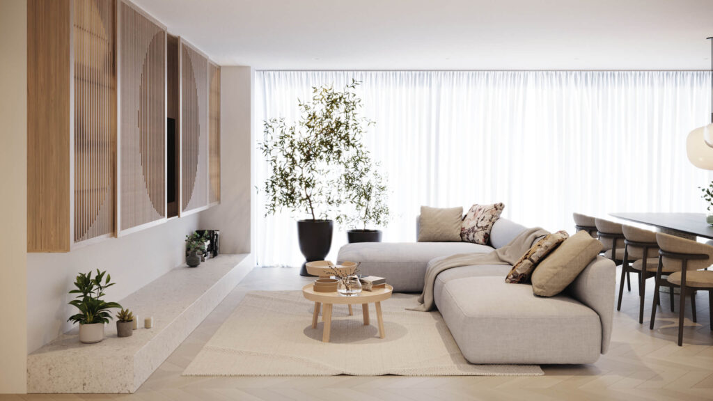 V marsikaterem sodobnem stanovanju je televizijski zaslon še vedno »oltar«, saj dominira nad preostalo opremo osrednjega prostora. V tem stanovanju pa so razmišljali drugače: skrili so ga za drsne panele. Ti prekrivajo eno od sten, vendar so postavljeni tako, da zaprti tvorijo očiten krog, ko pa panele razprejo, se izza njih pokaže TV-zaslon. Celota je občudovanja vredna.