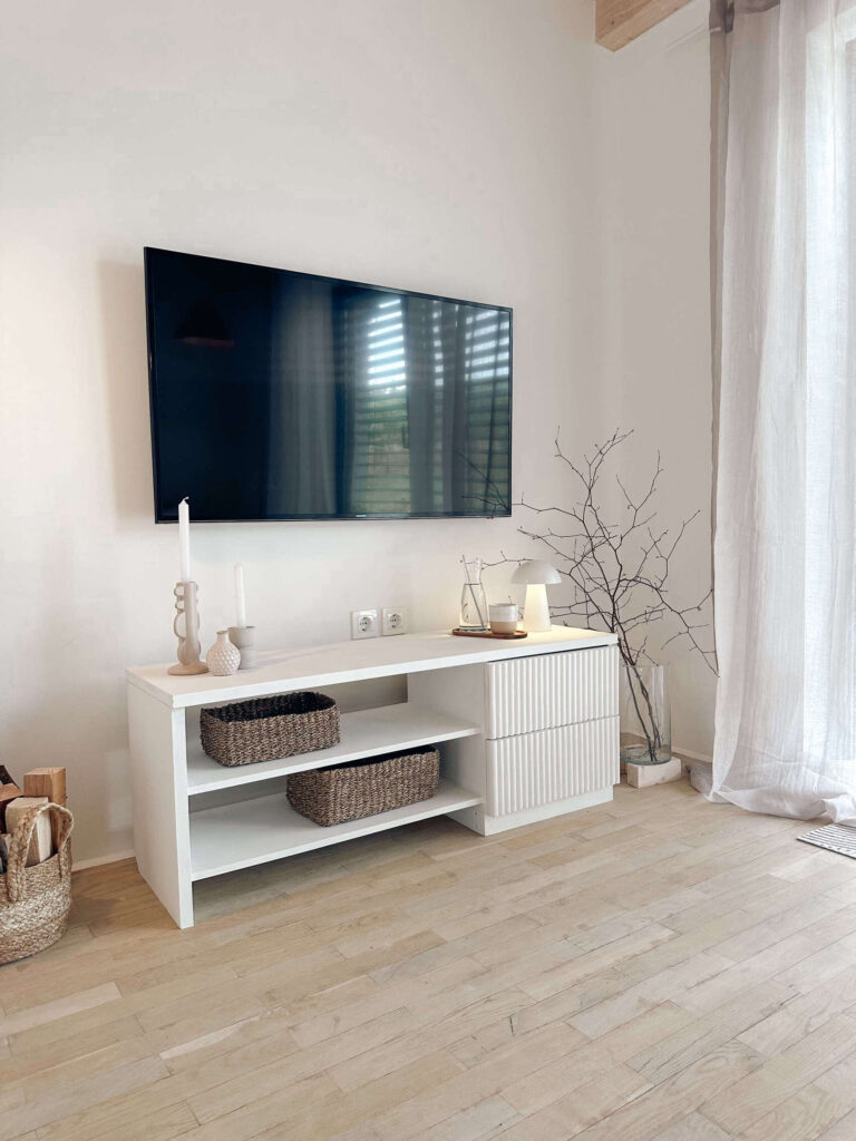 Že od začetka je vedela, da bo hiška dobila leseno fasado in skandinavski značaj. Les jo spremlja povsod: zunanjost je obložena z lesom, ki ga je Suzana obdelala z raztopino železovega sulfata, da je dobil naravno posivel videz; notranjost prežema masiven les, osvetljen in zaščiten z belim lugom, ki preprečuje rumenenje in prostoru daje svetlobo. Les ni le material, ampak duša hiške – vsak kos govori zgodbo truda in ročnega dela.