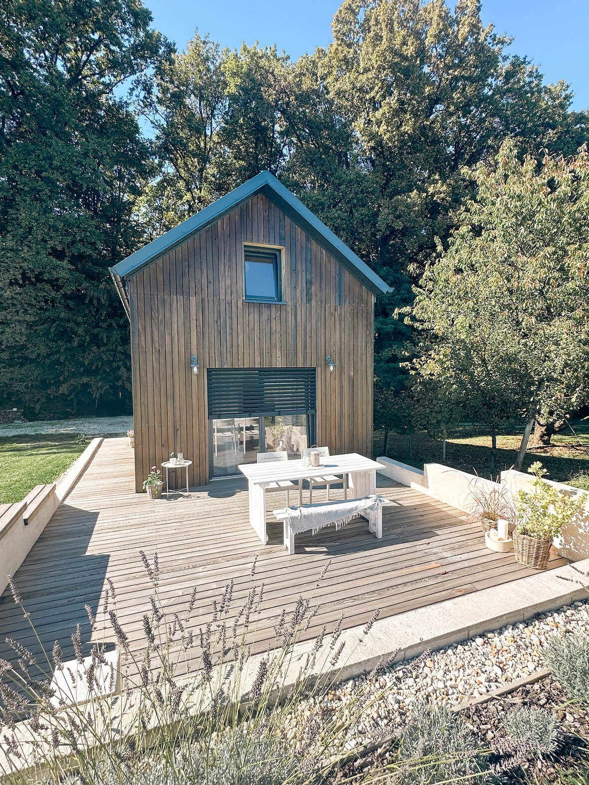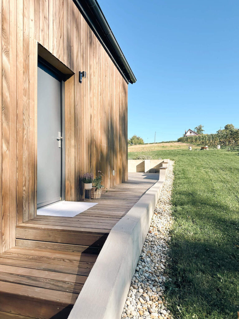 Les je tudi zunaj glavna nit. Terasa, obdelana na enak način kot fasada, se elegantno ovija okoli hiše in povezuje vhod z vrtom. Dvorišče je minimalistično urejeno: velika zelena površina z nekaj rožami, predvsem sivko, ter kurišče za druženje in kuhanje na ognju. Ob gozdu je dovolj prostora za parkiranje štirih avtomobilov – funkcionalno, a brez odvečnih elementov.
