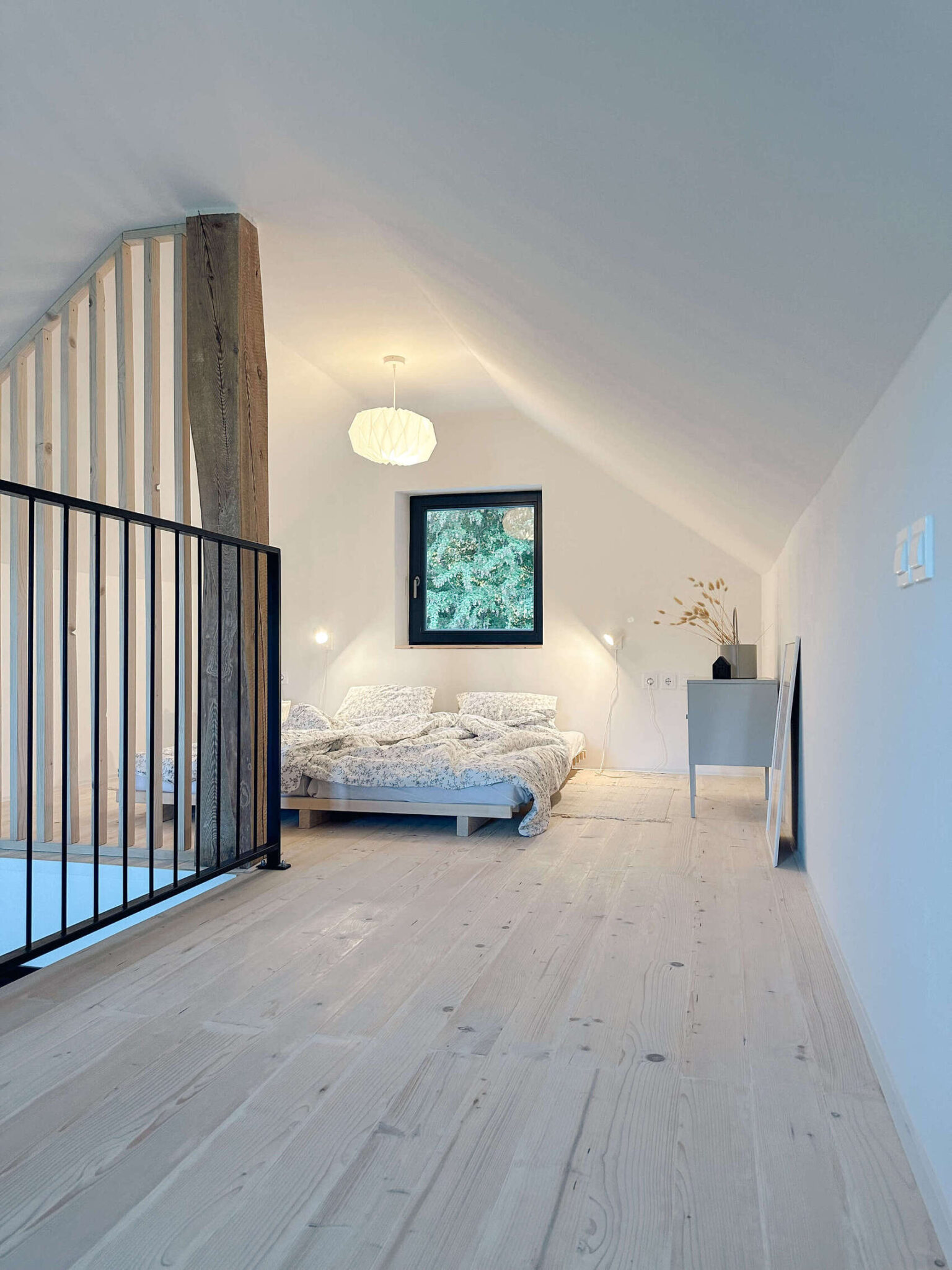 Mansarda je odprta in prilagodljiva. Na eni strani stoji letvena postelja, ki daje občutek zračnosti, na drugi strani pa prostor za knjižnico ali domačo pisarno. Odprtost omogoča svobodno prehajanje svetlobe in fleksibilno uporabo.