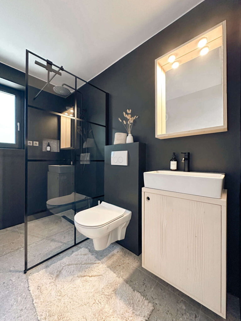 Kopalnica je Suzanin mali eksperiment – želela je sodoben, brezčasen videz brez klasičnih ploščic in fug. Za stene je uporabila Jubov sistem Microtopping, ki ustvari gladko, enotno površino. Tla krasi živahen terazzo, temne stene pa prostoru dajejo mirno, intimno atmosfero, ki se zvečer spremeni v pravi kotiček za sprostitev. Posebnost je velika walk-in tuš kabina in pohištvo iz masivnega lesa po meri.