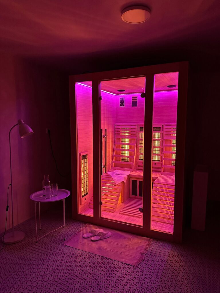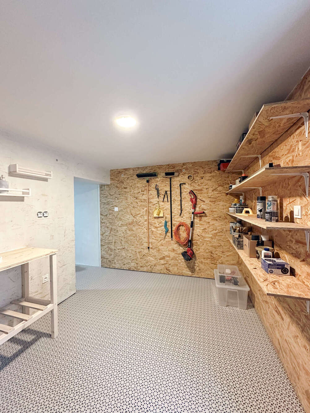 Klet je Suzana razdelila na dva dela. V prvem je utility prostor z umivalnikom, pralnim strojem in veliko shranjevalnega prostora, organiziranega s policami in perforirano stensko ploščo. Stene krasijo OSB-plošče, ki dajejo prostoru ustvarjalno, delovno energijo. Drugi del skriva IR-savno za tri osebe, ki hiški doda element sprostitve in občutek majhnega luksuza. Po tleh so položene PVC-ploščice na klik, ki dihajo in hkrati zagotavljajo toplino, tako da se po njih lahko hodi bos tudi pozimi.