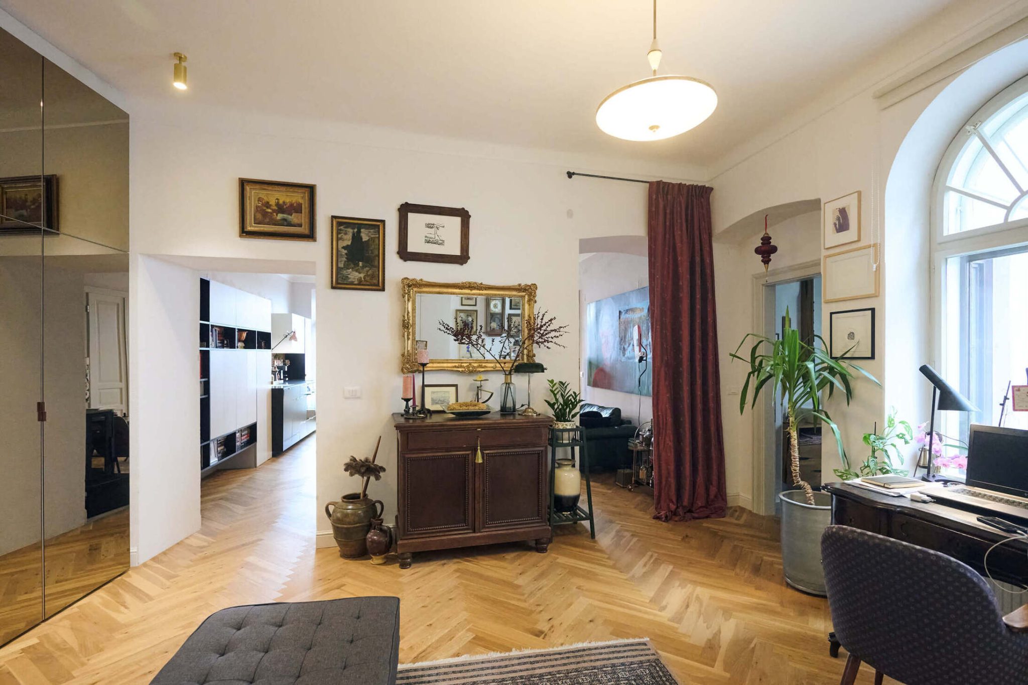 Prenova stanovanja je bila obsežna. Suzana je spremenila tloris, da bi prostor postal bolj odprt in funkcionalen. Na 80 kvadratnih metrih je odstranila nenosilne stene, da bi povečala bivalne prostore, in kopalnico premestila bližje spalnici. »Bilo je treba tudi odpreti nova vrata in povečati obstoječe odprtine, da bi prostor ohranil svojo zgodovinsko podobo,« pojasnjuje arhitektka.