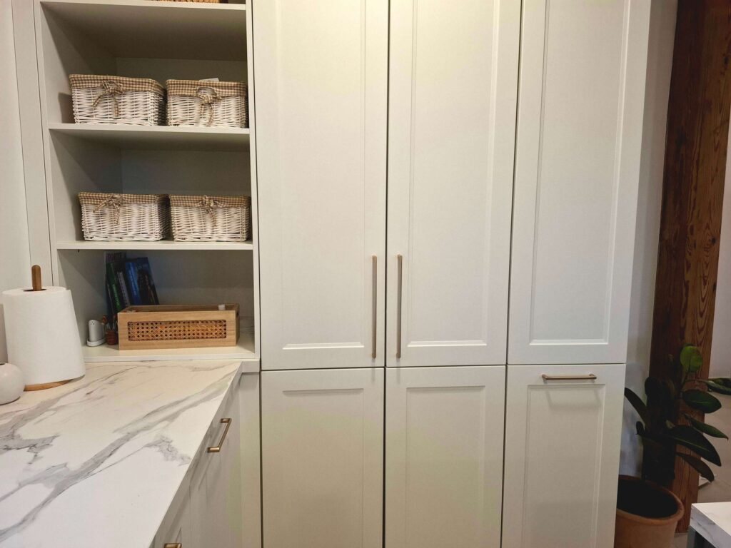 S severne strani je umeščena pralnica z dodatnim tušem za kužke ter zasebnim zunanjim vhodom – rešitev, ki odraža praktičnost investitorjev in navezanost na življenje z živalmi. V sklopu kuhinje je integrirana skrita shramba, dostopna skozi kuhinjske elemente, s čimer so ohranili vizualno izčiščenost kuhinjskega prostora. Program dopolnjujejo kabinet, WC in tehnični prostor, popolnoma ločen spalni trakt pa vključuje še garderobo in prostorno kopalnico.