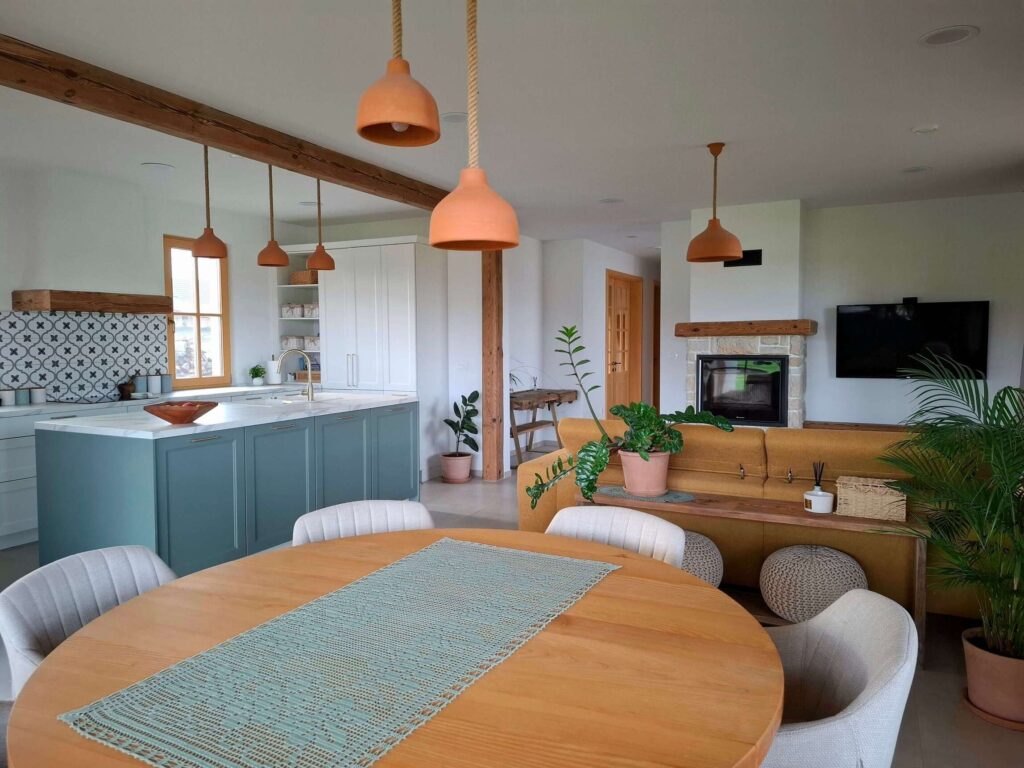 Poseben pečat dajo tudi ohranjeni tramovi iz stare hiše, ki je nekoč stala na tem mestu. Vgrajeni so nad kaminom in v detajlih okoli kuhinje. Del stare hiše ostaja prisoten tudi na vrtu, kjer so našle prostor starinske opeke – drobni opomnik na kontinuiteto življenja in spoštovanje preteklosti.