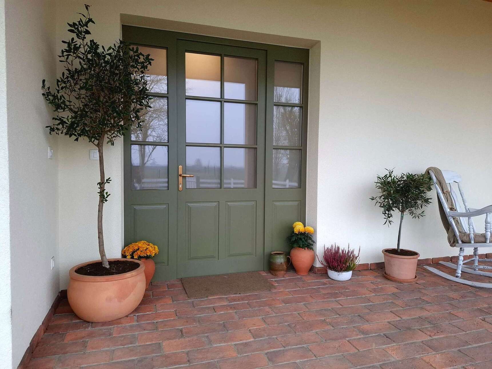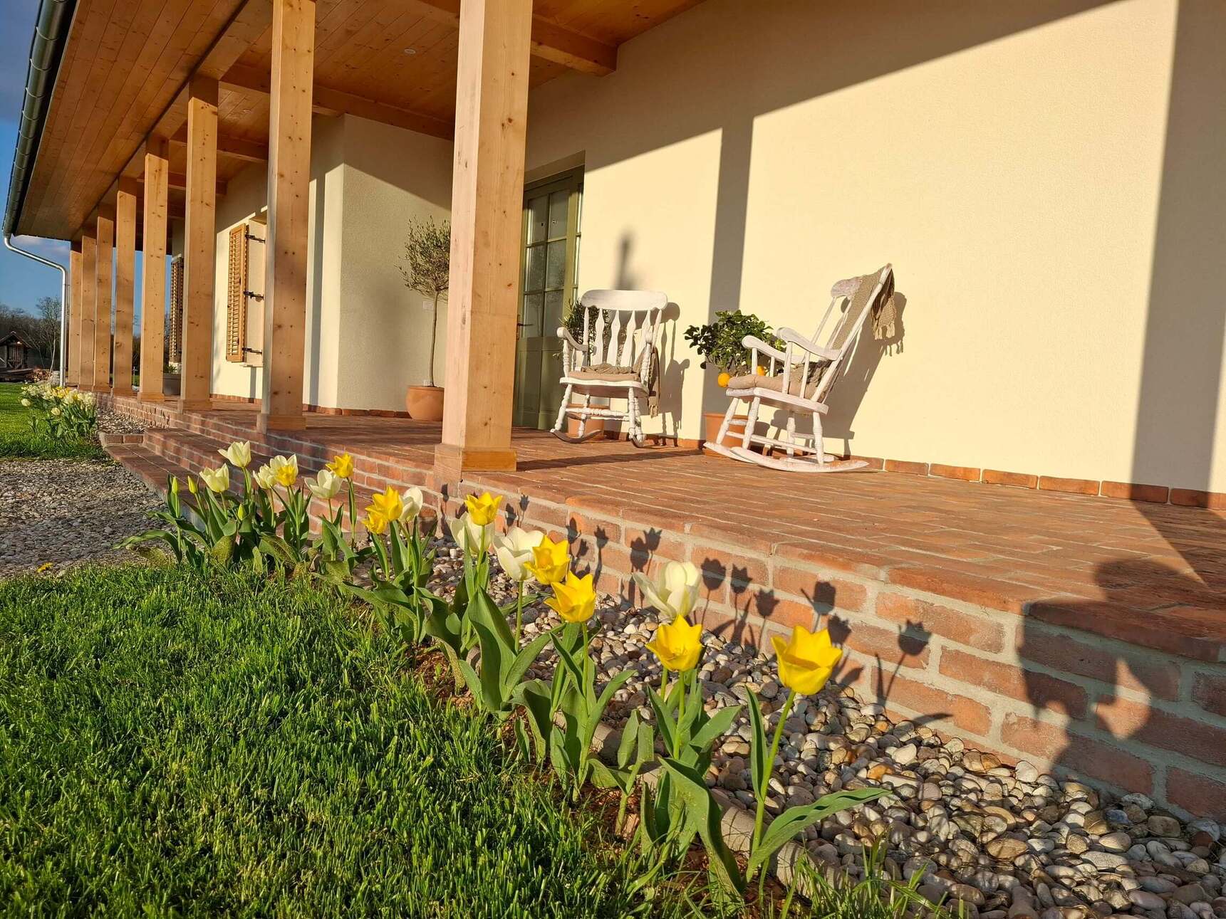Poseben pečat dajo tudi ohranjeni tramovi iz stare hiše, ki je nekoč stala na tem mestu. Vgrajeni so nad kaminom in v detajlih okoli kuhinje. Del stare hiše ostaja prisoten tudi na vrtu, kjer so našle prostor starinske opeke – drobni opomnik na kontinuiteto življenja in spoštovanje preteklosti.