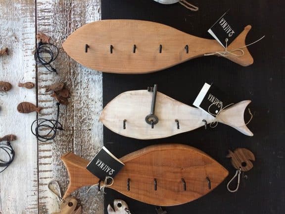 Tri lesene ribice, povezane z vrvico predstavljajo nadvse inovativen podstavek za posodo, ki ga lahko, ko ga ne uporabljate, razobesite na steno kot dekoracijo. Unikatno oblikovane ribice so izdelane iz oreha in premazane z naravnim oljem, po izročilu ustvarjalke pa lastniku prinašajo srečo.