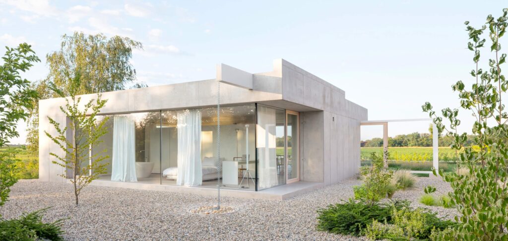 Na robu prekmurske ravnice, kjer se pogled brez zadržkov odpira proti poljem in nizkemu horizontu, stoji majhna betonska hiša, zasnovana ...